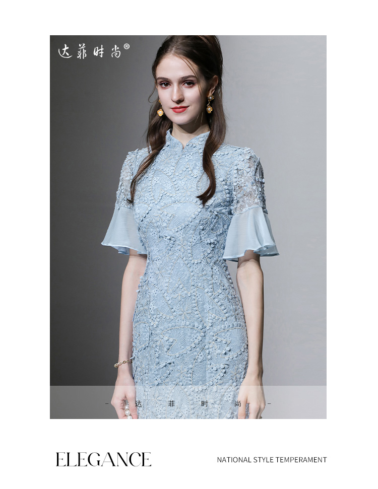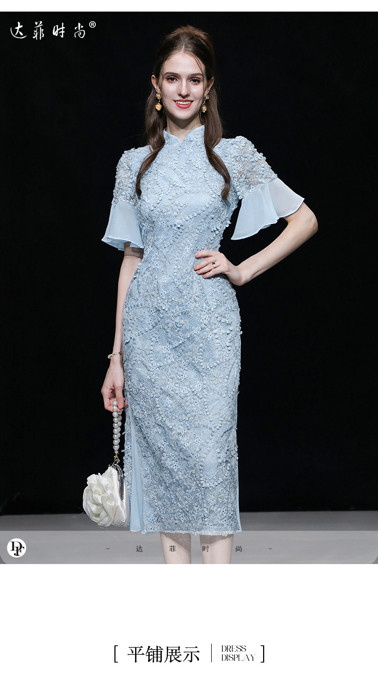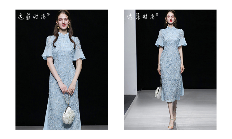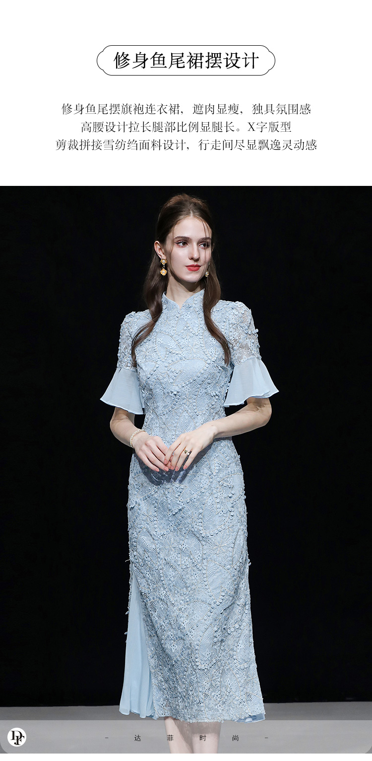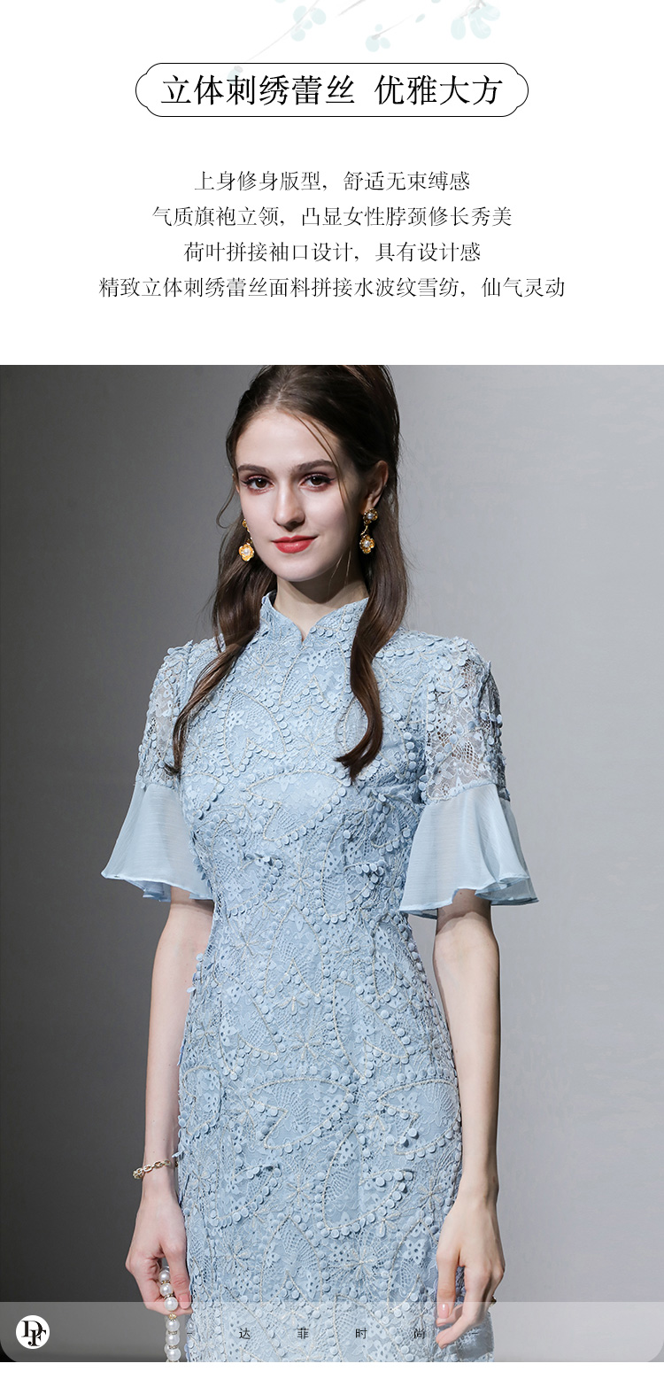 夏季女裝2023新款氣質淺灰藍修身收腰顯瘦蕾絲旗袍連衣裙長裙裙子