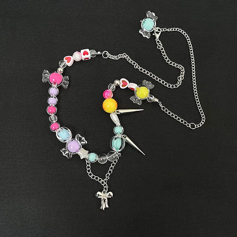 OUKECHUN多巴胺飾品彩色糖果愛心蝴蝶結項鏈y2k辣妹甜酷鎖骨鏈女