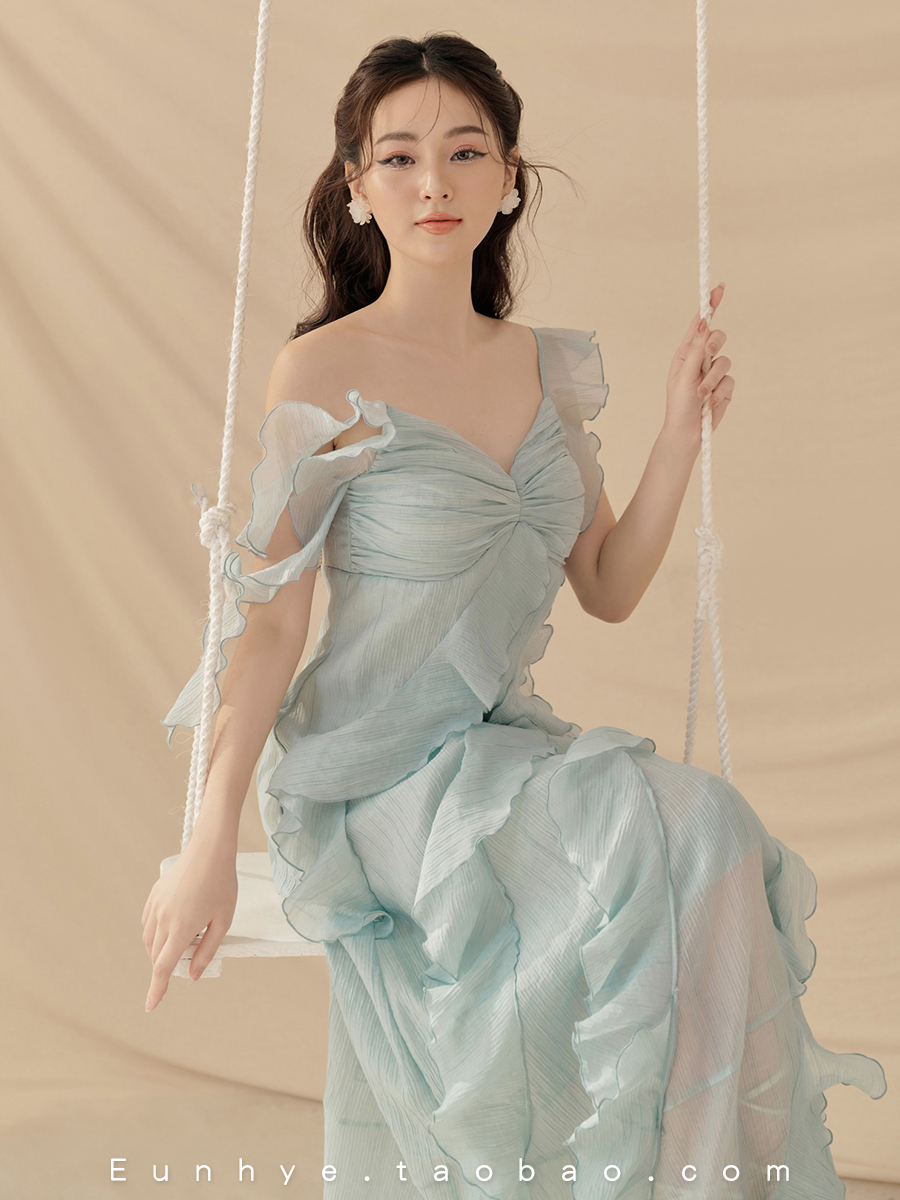越南小眾品牌MINT 2023夏季新品無袖落肩荷葉邊仙氣飄飄女神長裙