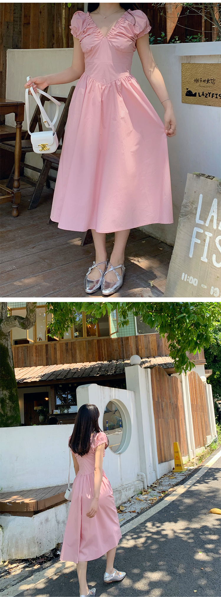 熙家小個子連衣裙女士裙子收腰V領過膝氣質法式顯瘦公主裙中長款
