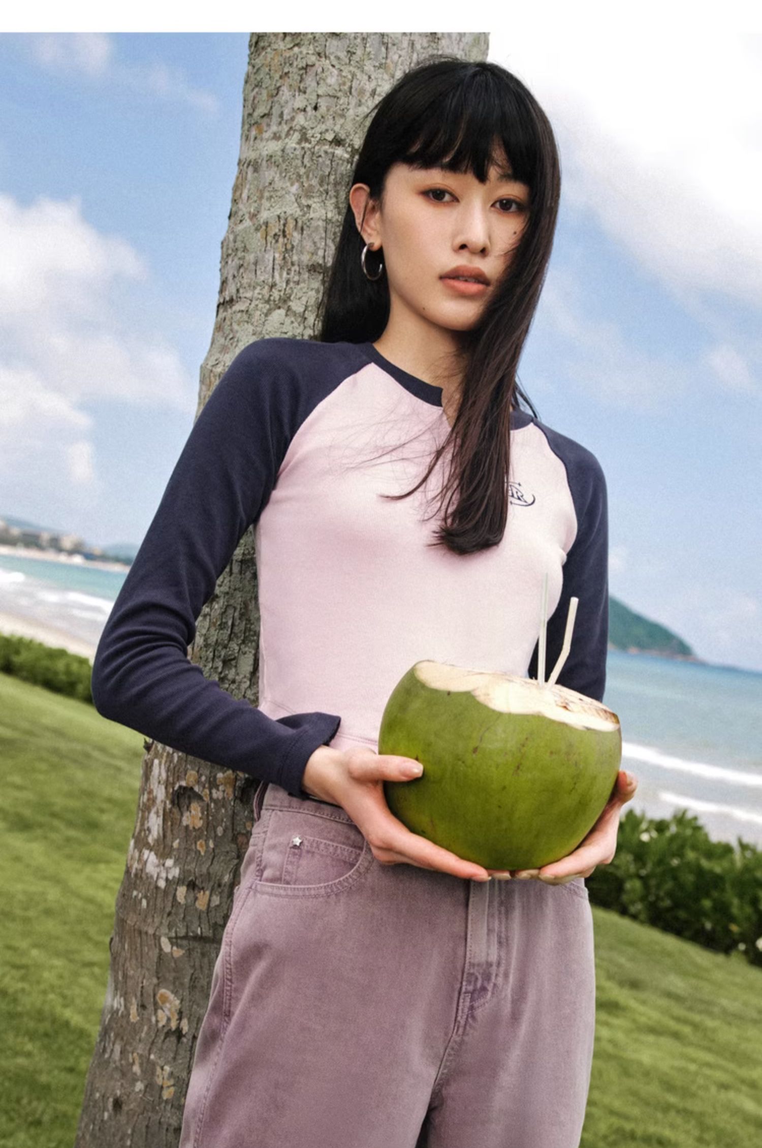 森馬長袖T恤女短款紫色木耳邊2023秋季新款修身肌理針織開衫俏皮