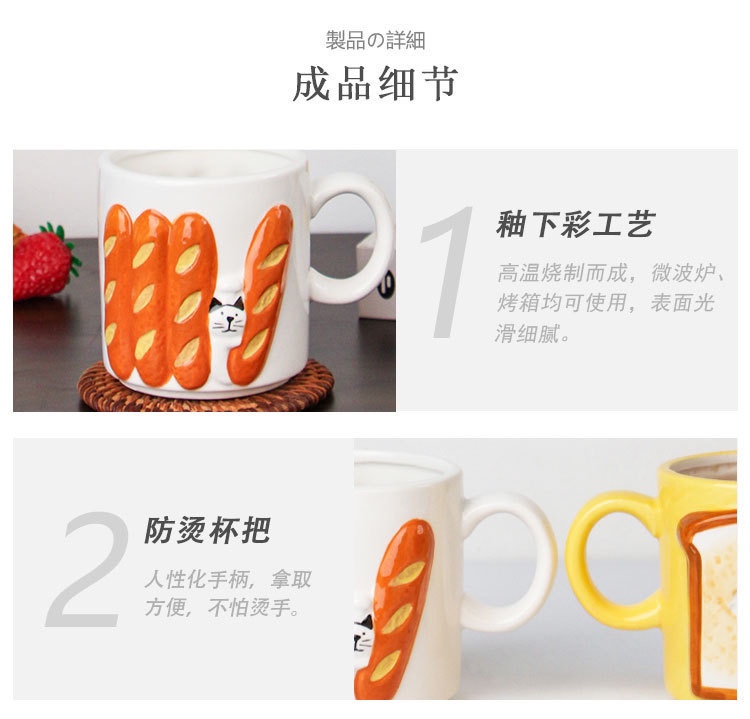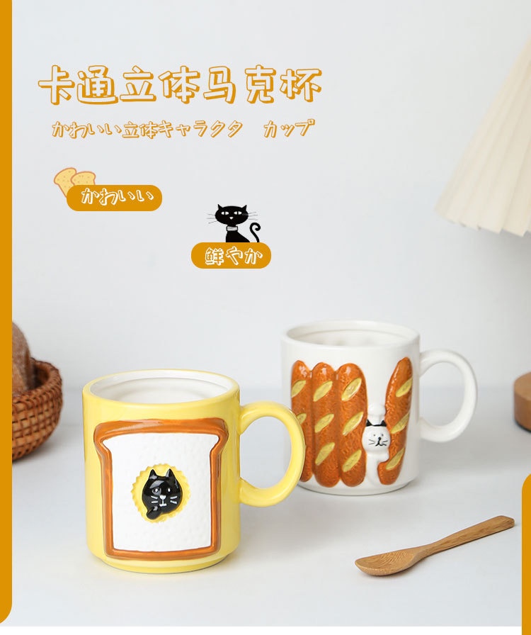 日式陶瓷杯子吐司貓咪法棍浮雕馬克杯可愛ins早餐杯咖啡杯家用