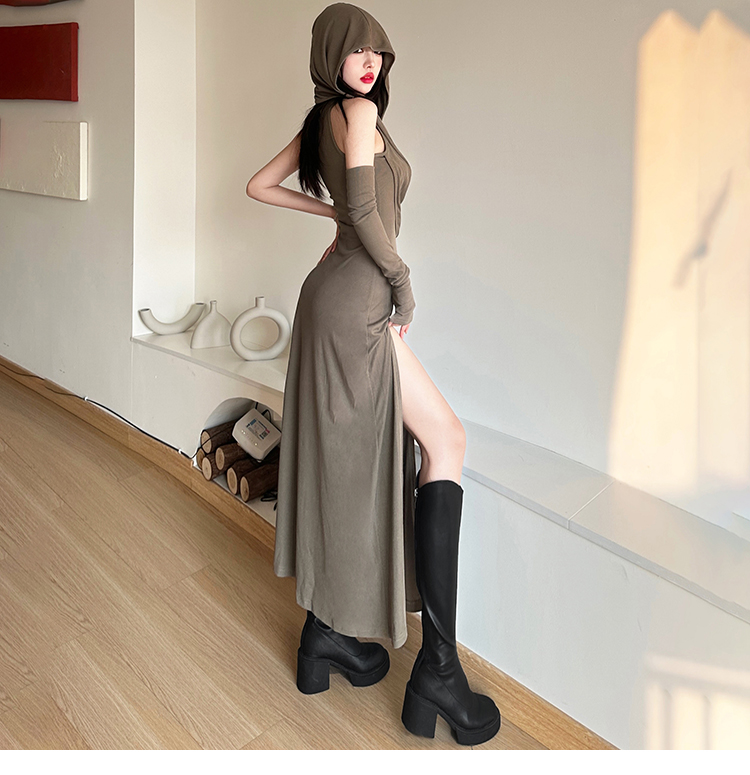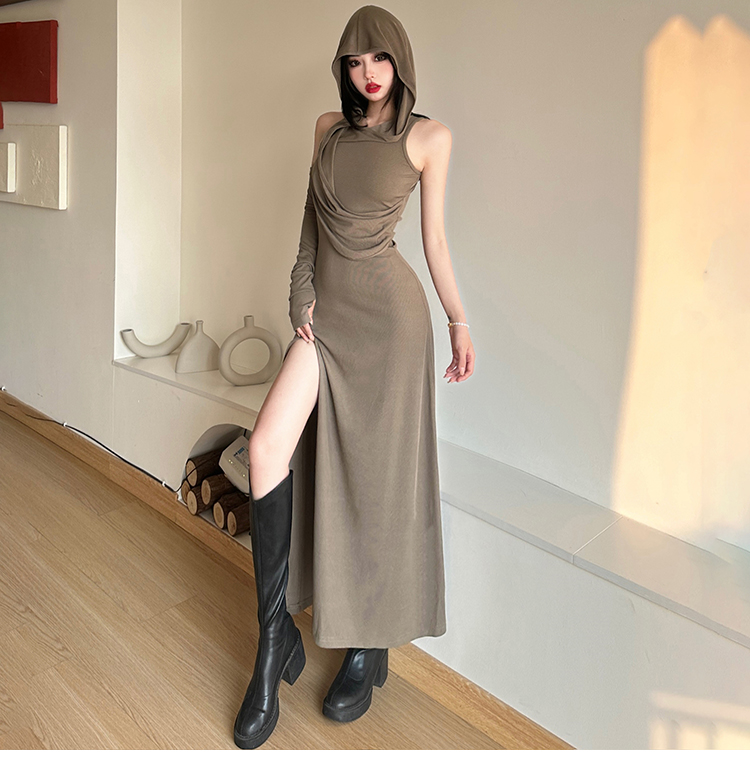 KLalien 復古廢土風不規則垂感連帽連衣裙辣妹超顯身材高開衩長裙