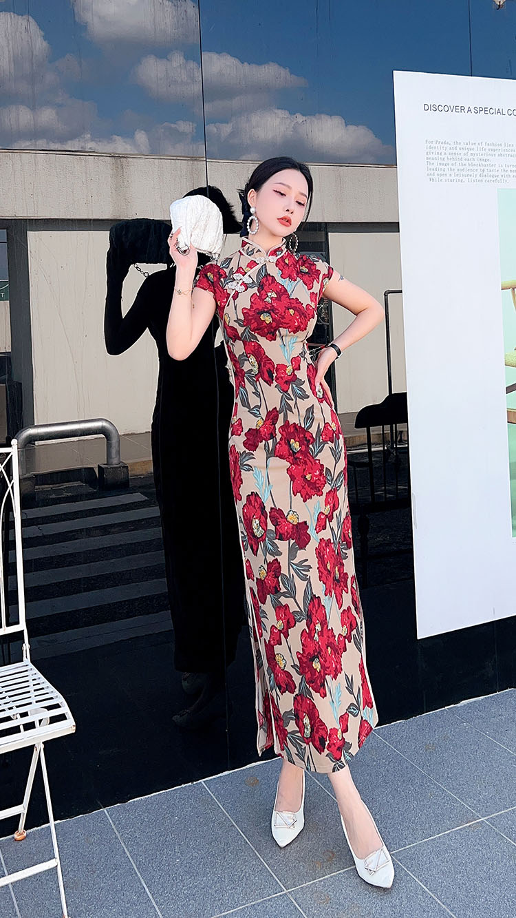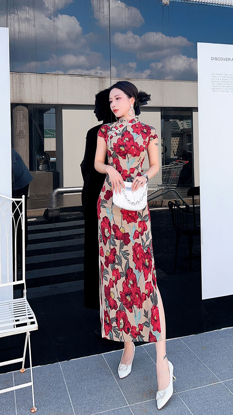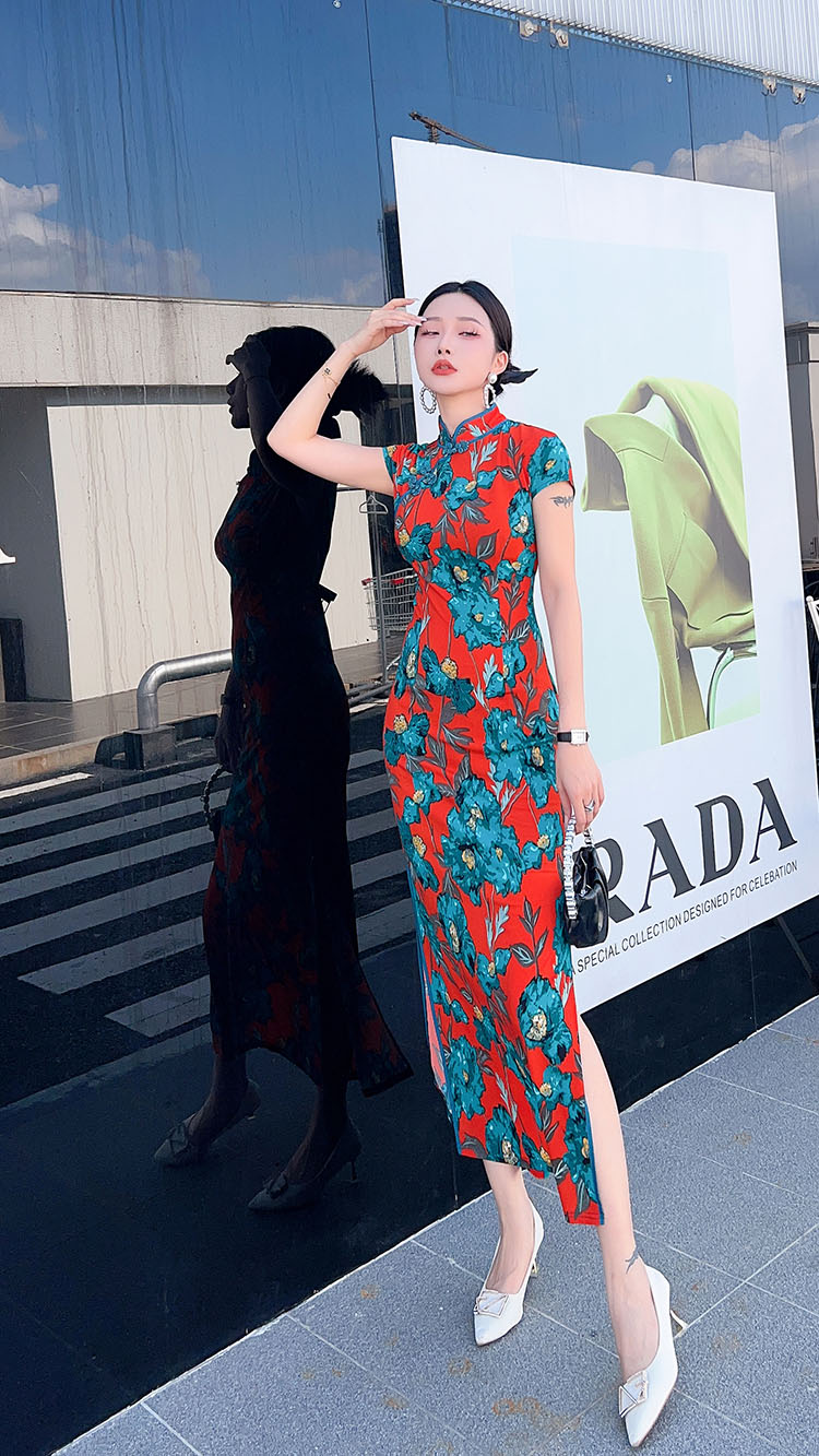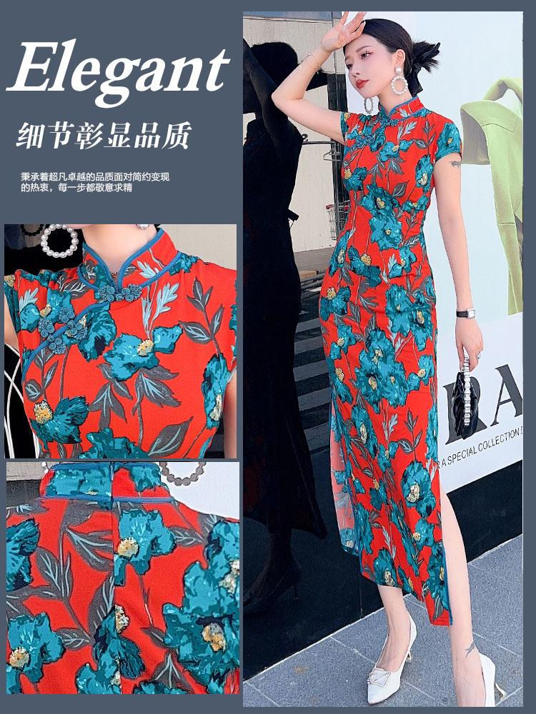 紅色印花復古旗袍女夏新款氣質新中式國風斜襟立領修身連衣裙長裙
