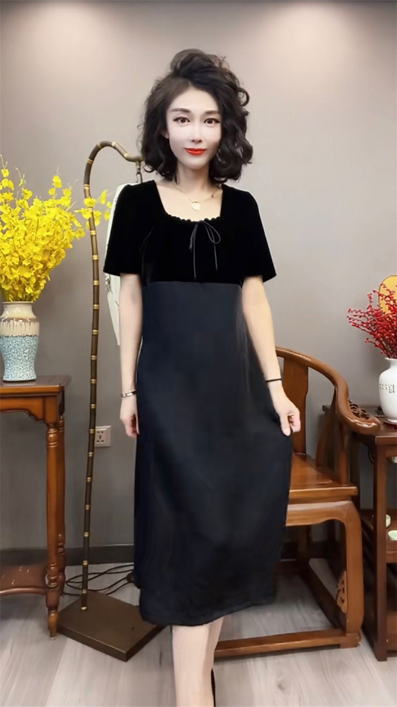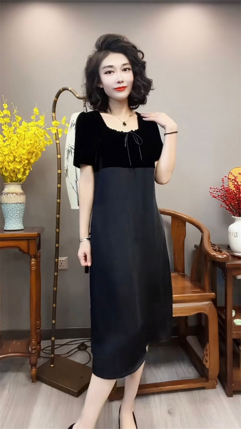 炸街網紅爆款女裝2023年夏季新款洋氣修身顯瘦拼接絲絨過膝連衣裙