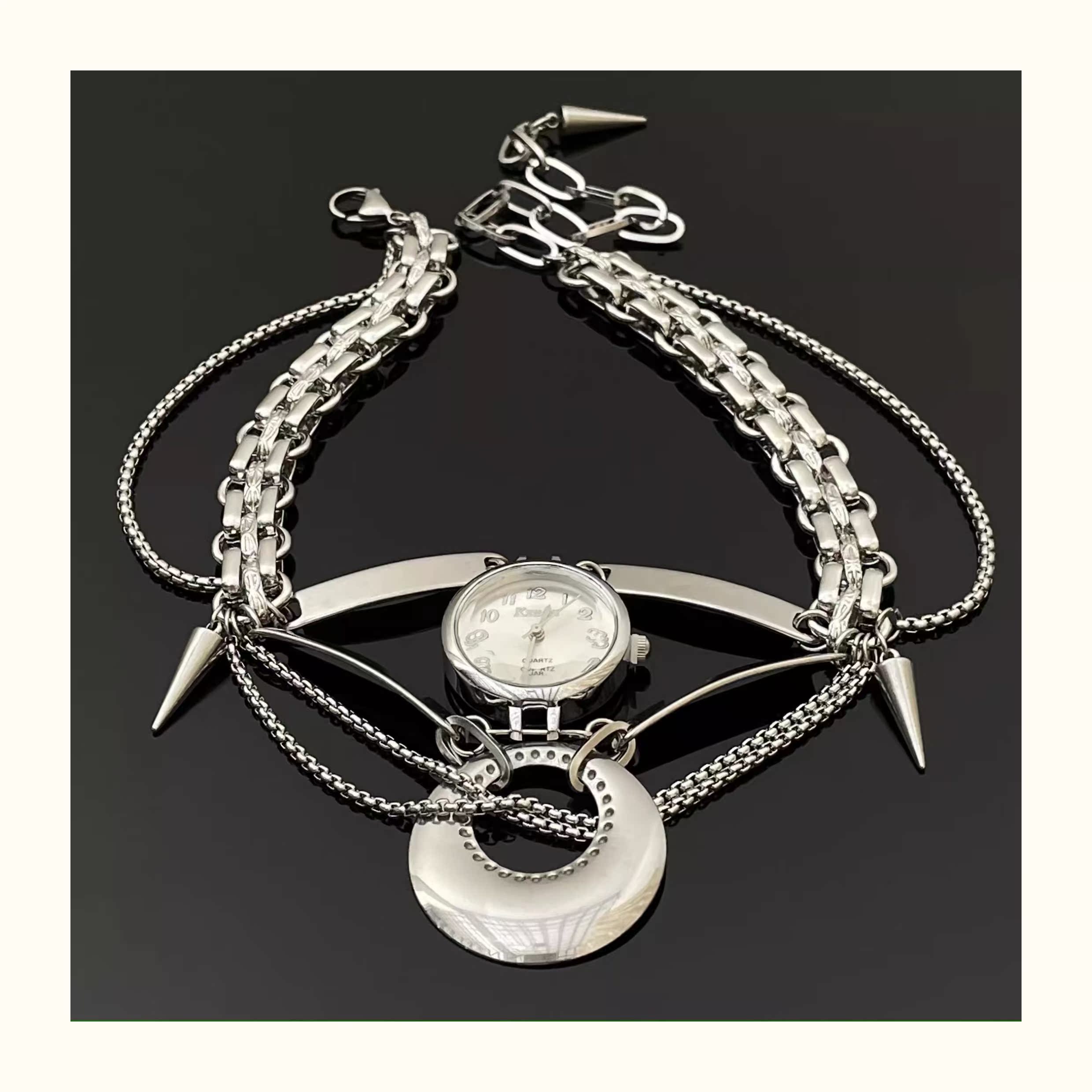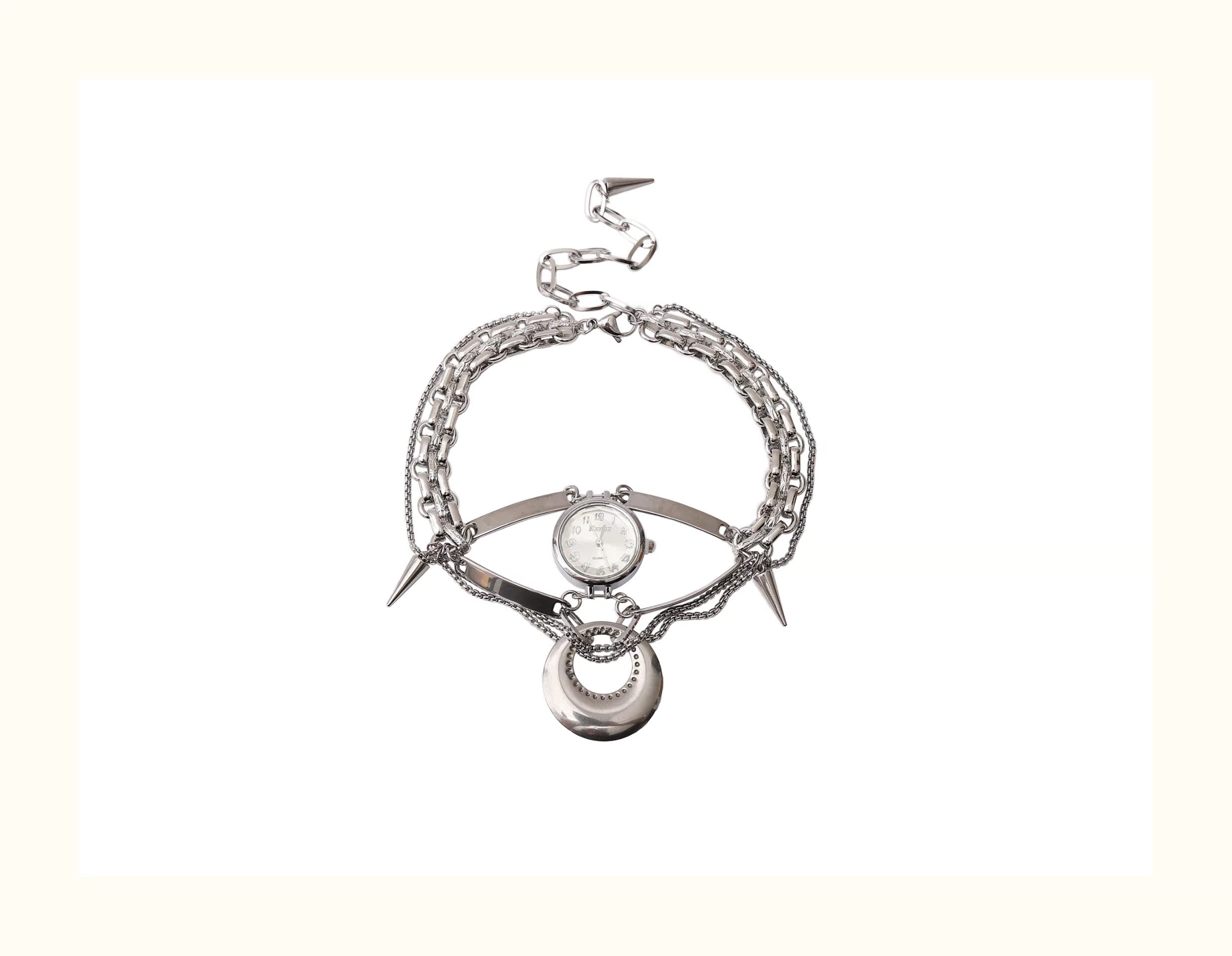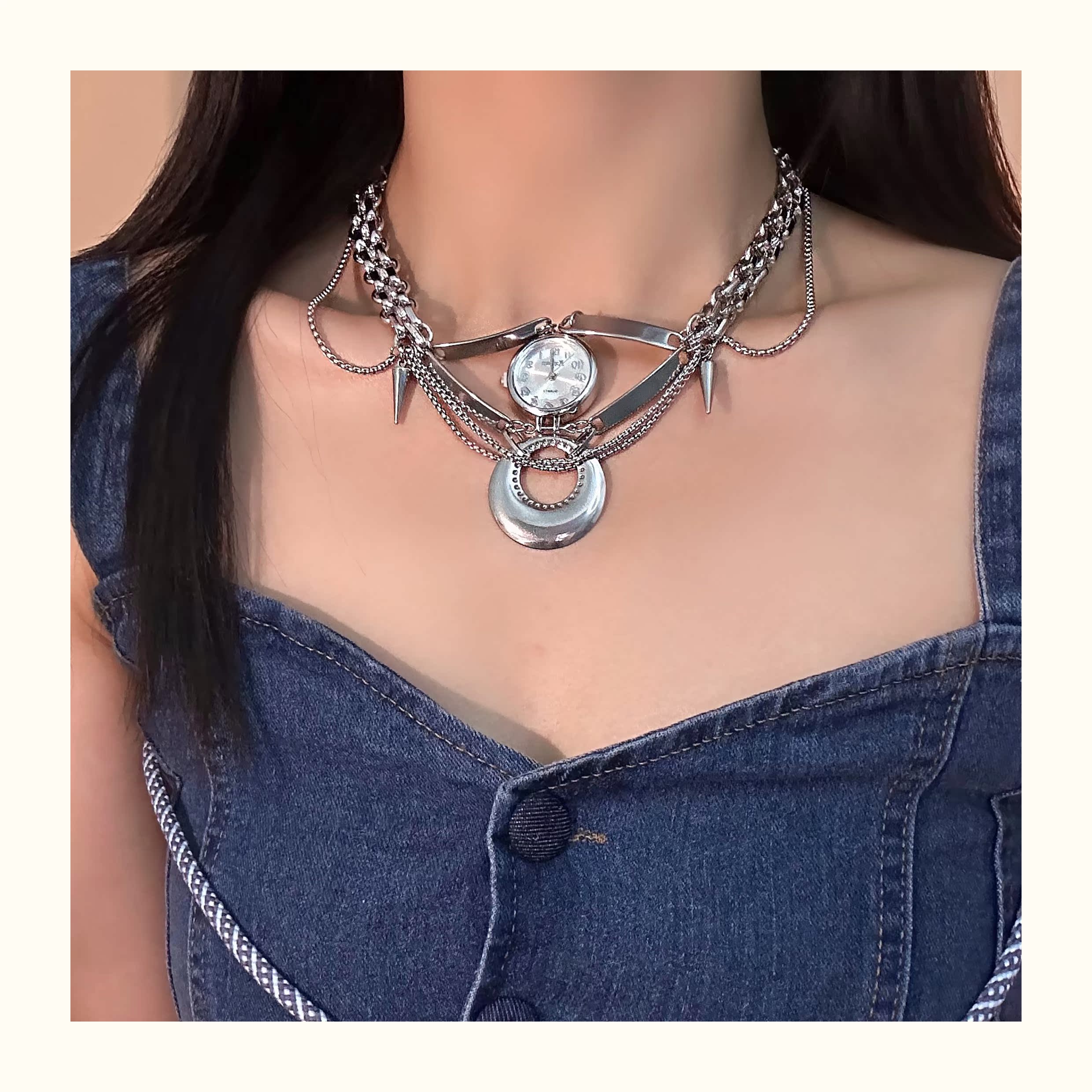 圓形鐘表鉚釘項鏈潮酷重工y2k流蘇個性復古鎖骨鏈頸鏈歐美配飾女