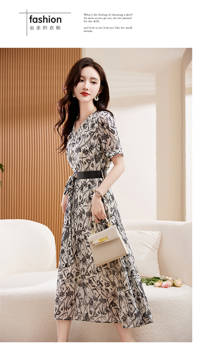 杭州大牌真絲連衣裙女裝夏季新款V領氣質高腰短袖碎花桑蠶絲裙子