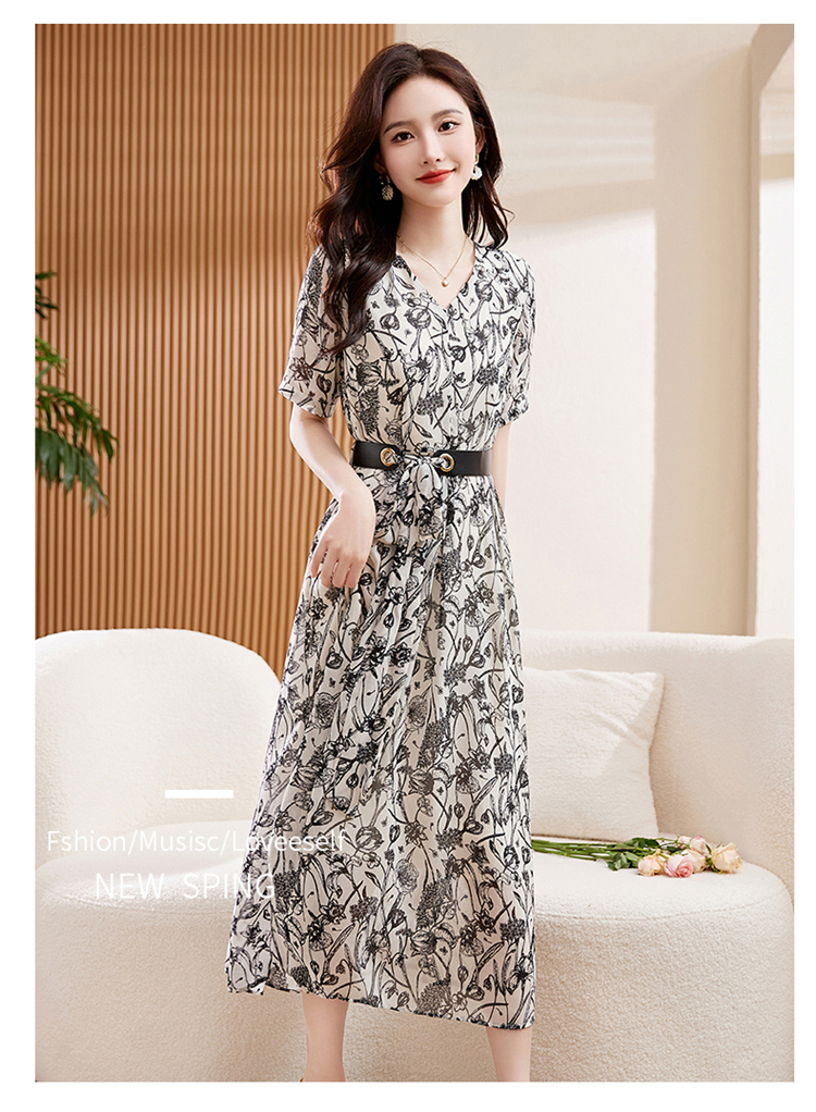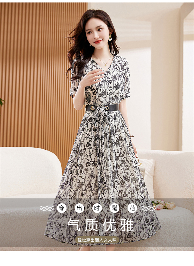 杭州大牌真絲連衣裙女裝夏季新款V領氣質時尚短袖印花桑蠶絲裙子