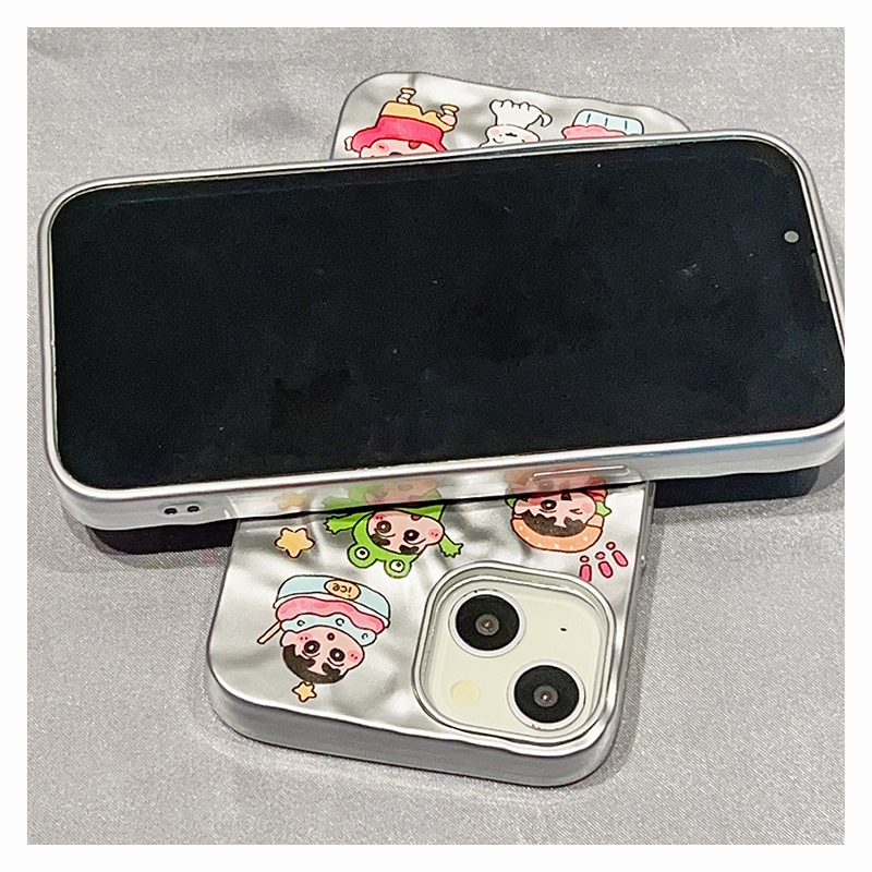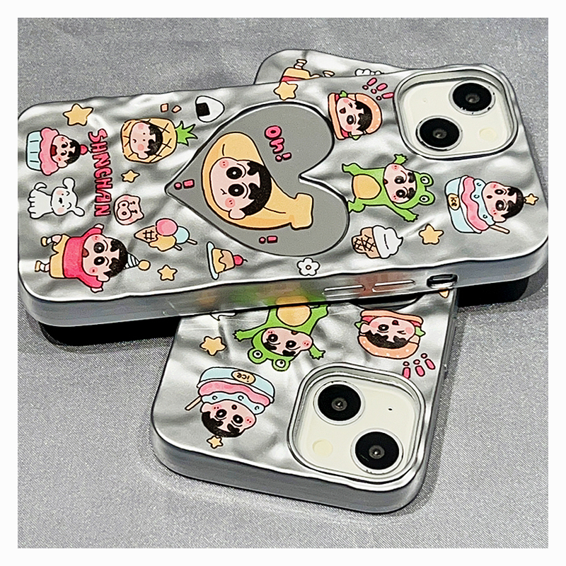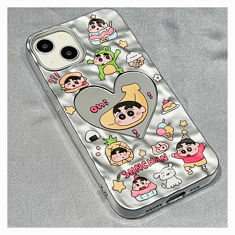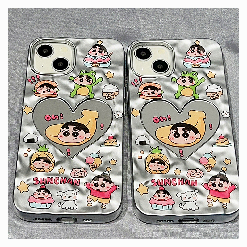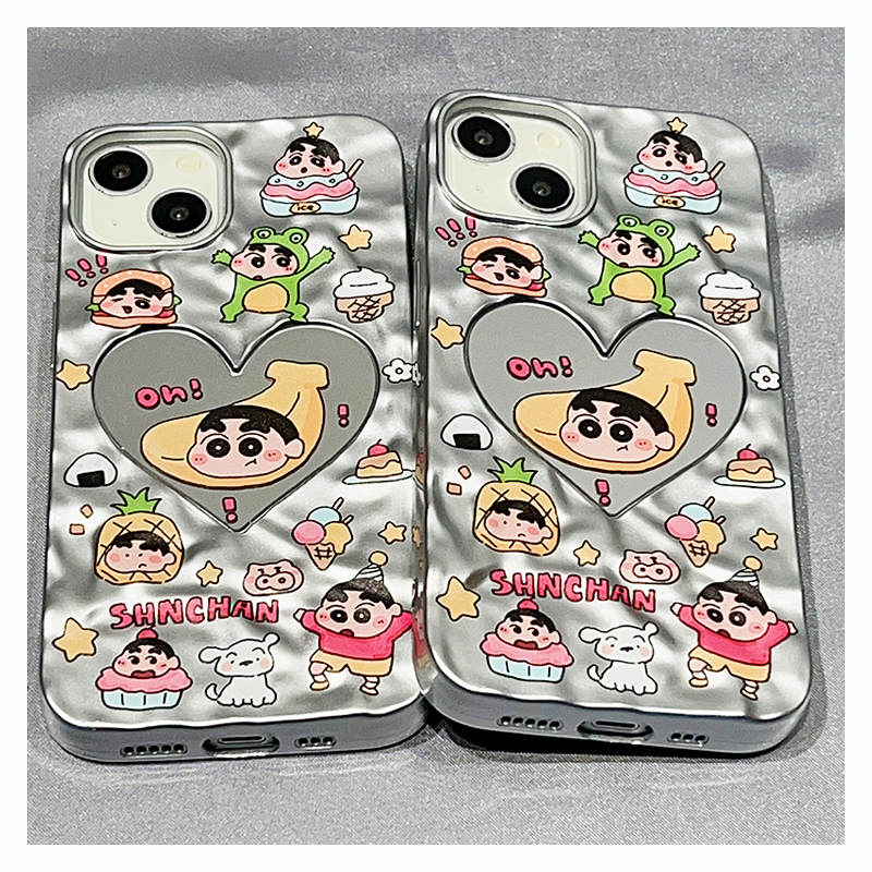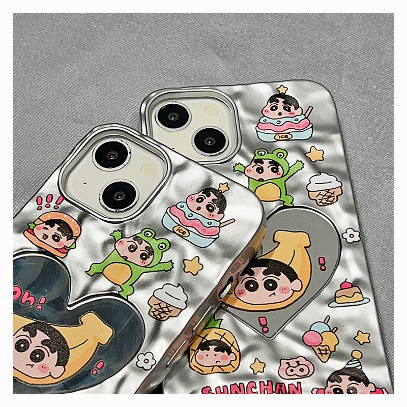 銀色愛心鏡子蠟筆小新適用蘋果14promax手機殼iphone13女款14pro新款12可愛網紅創意11軟13pro防摔15pro硅膠