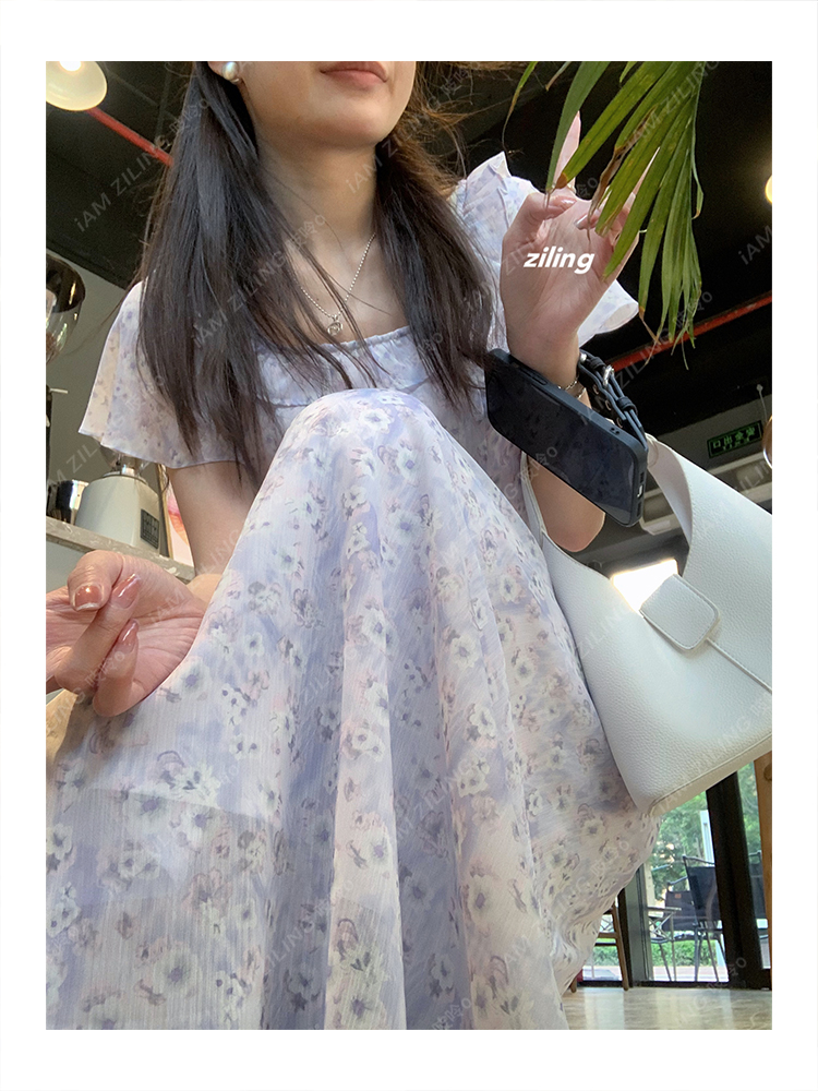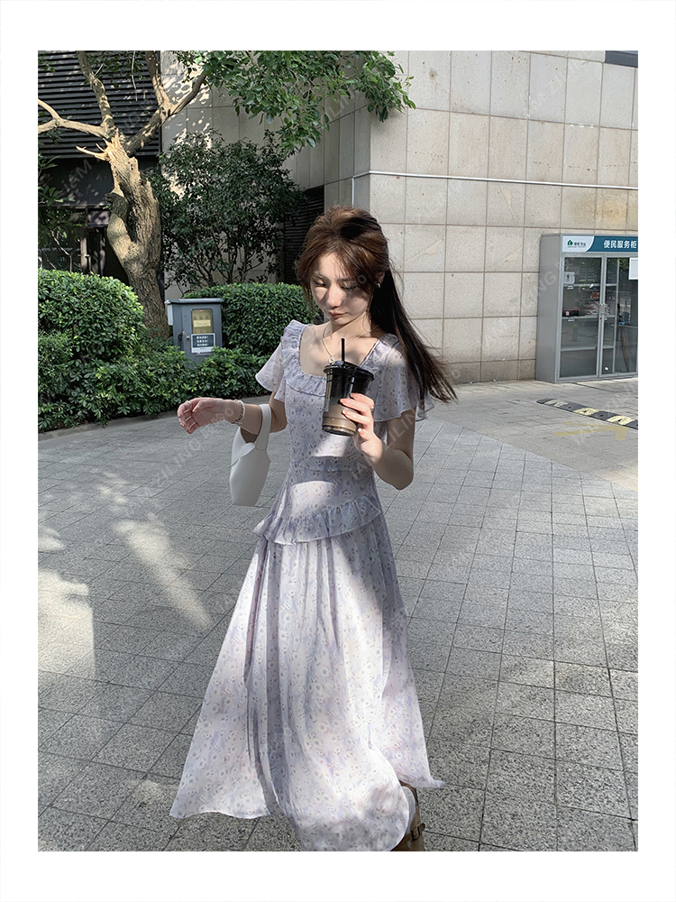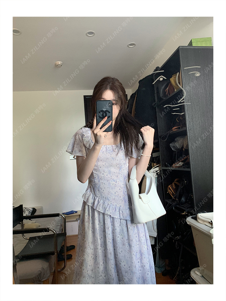 吱呤 洋氣減齡連衣裙女夏季2023新款垂直感長裙精致方領木耳邊裙