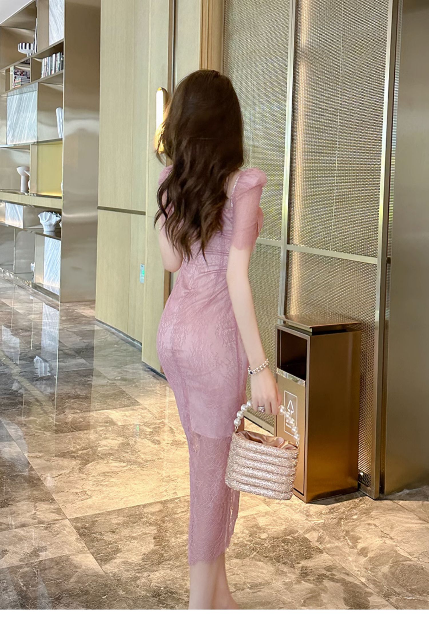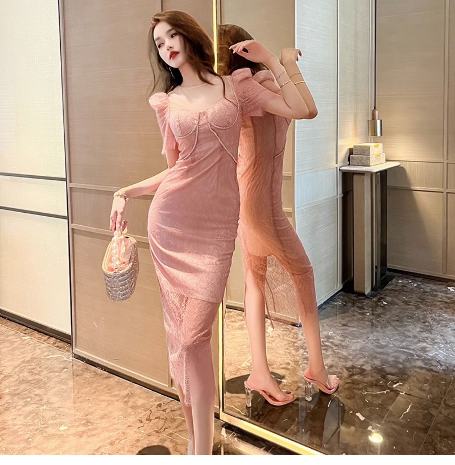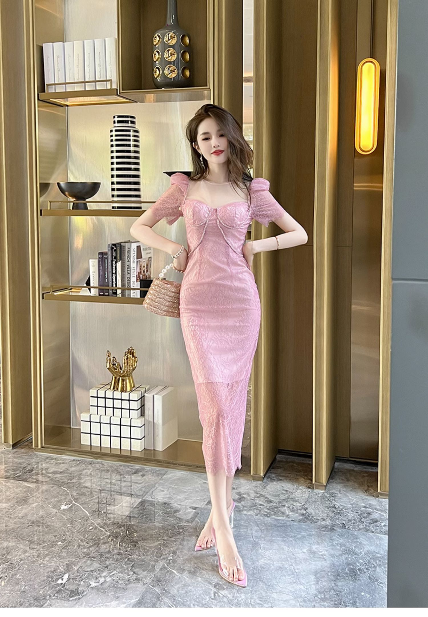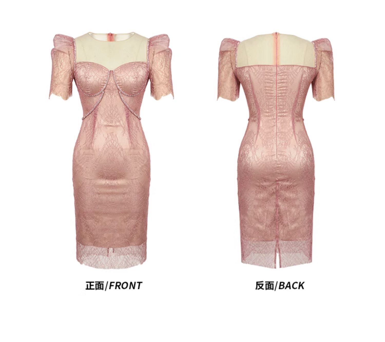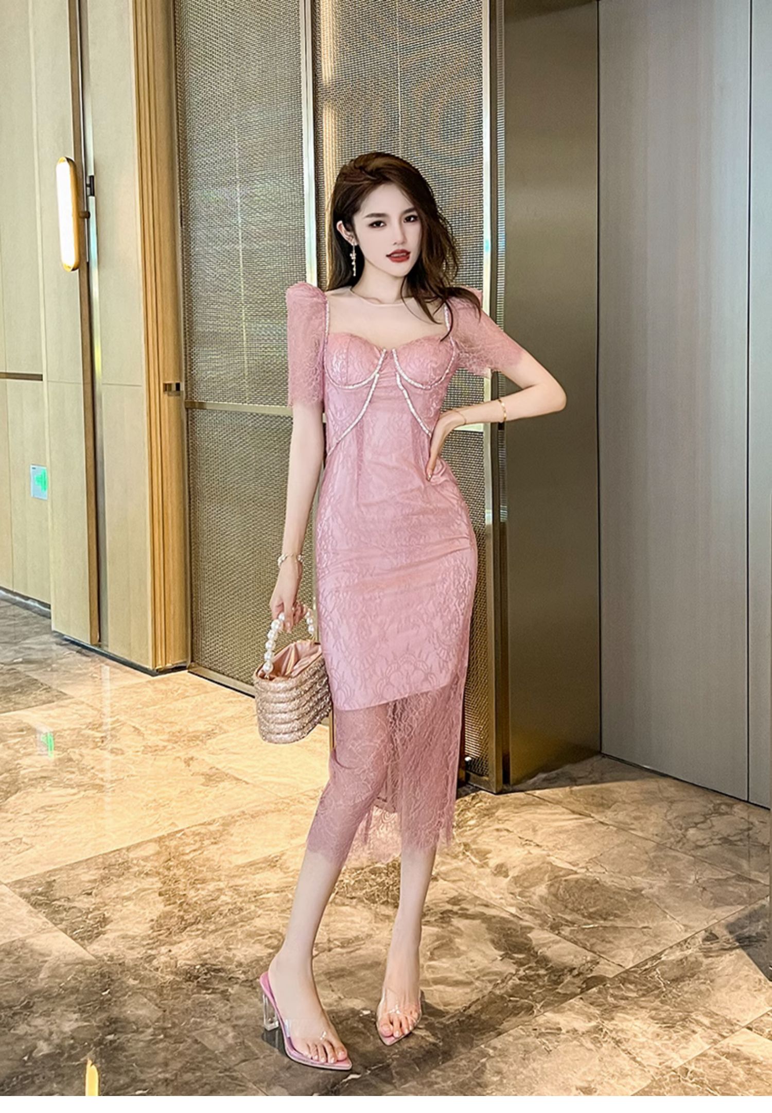 重工高級感蕾絲連衣裙新款粉色淑女名媛風輕奢減齡修身短袖包臀裙