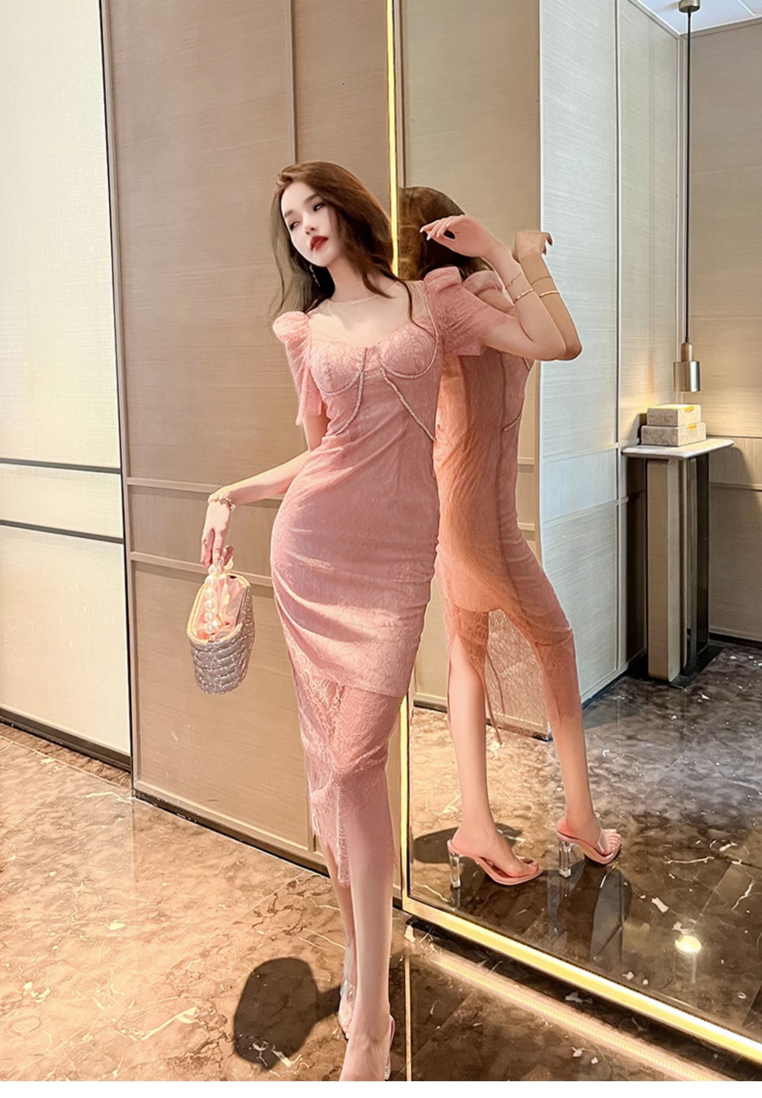 純欲性感名媛風亮片連衣裙女中長款包臀修身氣質方領粉色網紗裙子