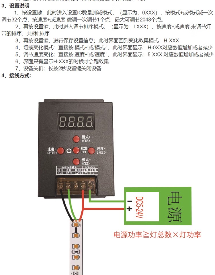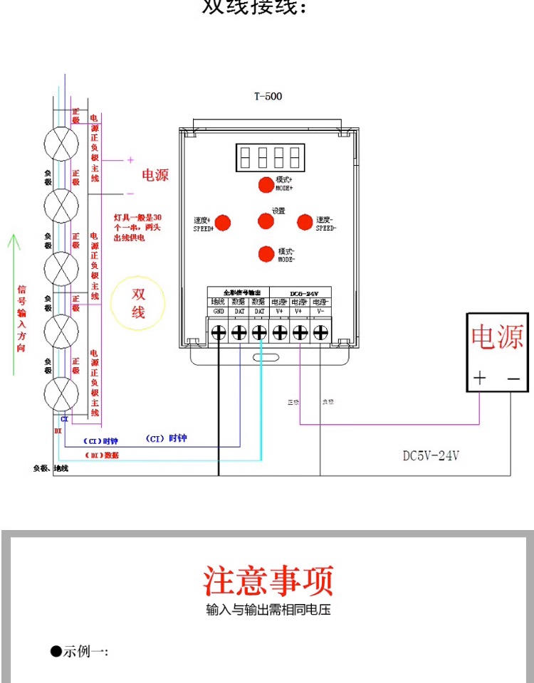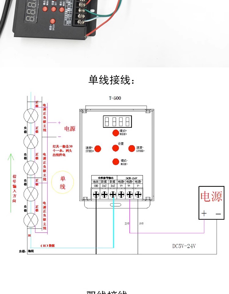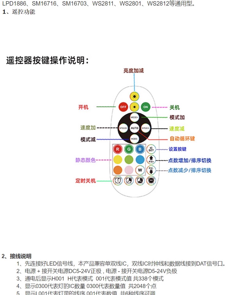 RF25鍵遙控T500幻彩燈具控制2048像素全彩燈條調光器5-24V帶數顯
