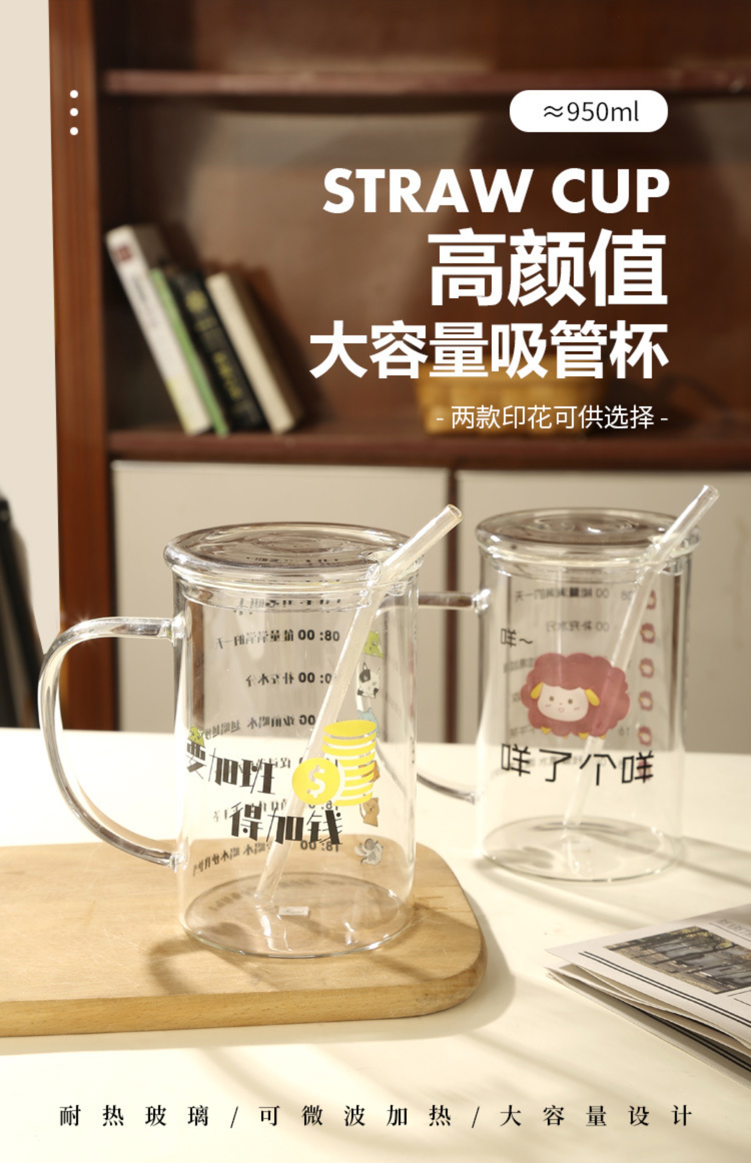 高硼硅耐熱玻璃杯大容量吸管水杯可愛帶把手可微波耐高溫杯子家用
