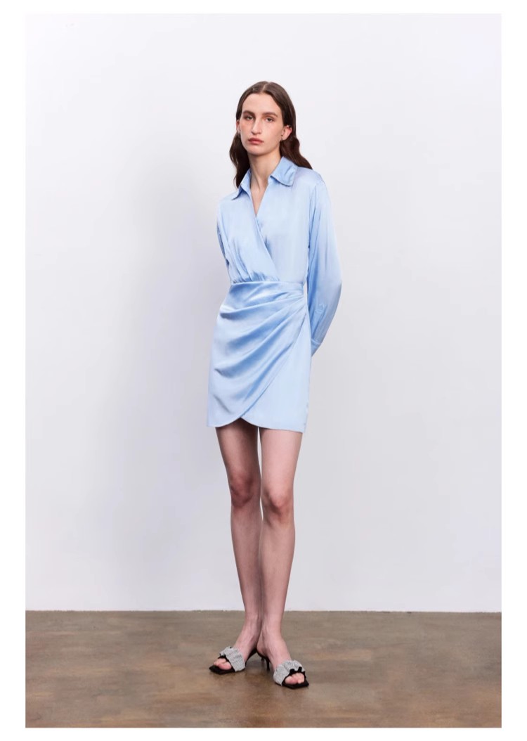 Fabirque 真絲混紡褶皺襯衫連衣裙2023秋季新款優雅修身裙子女
