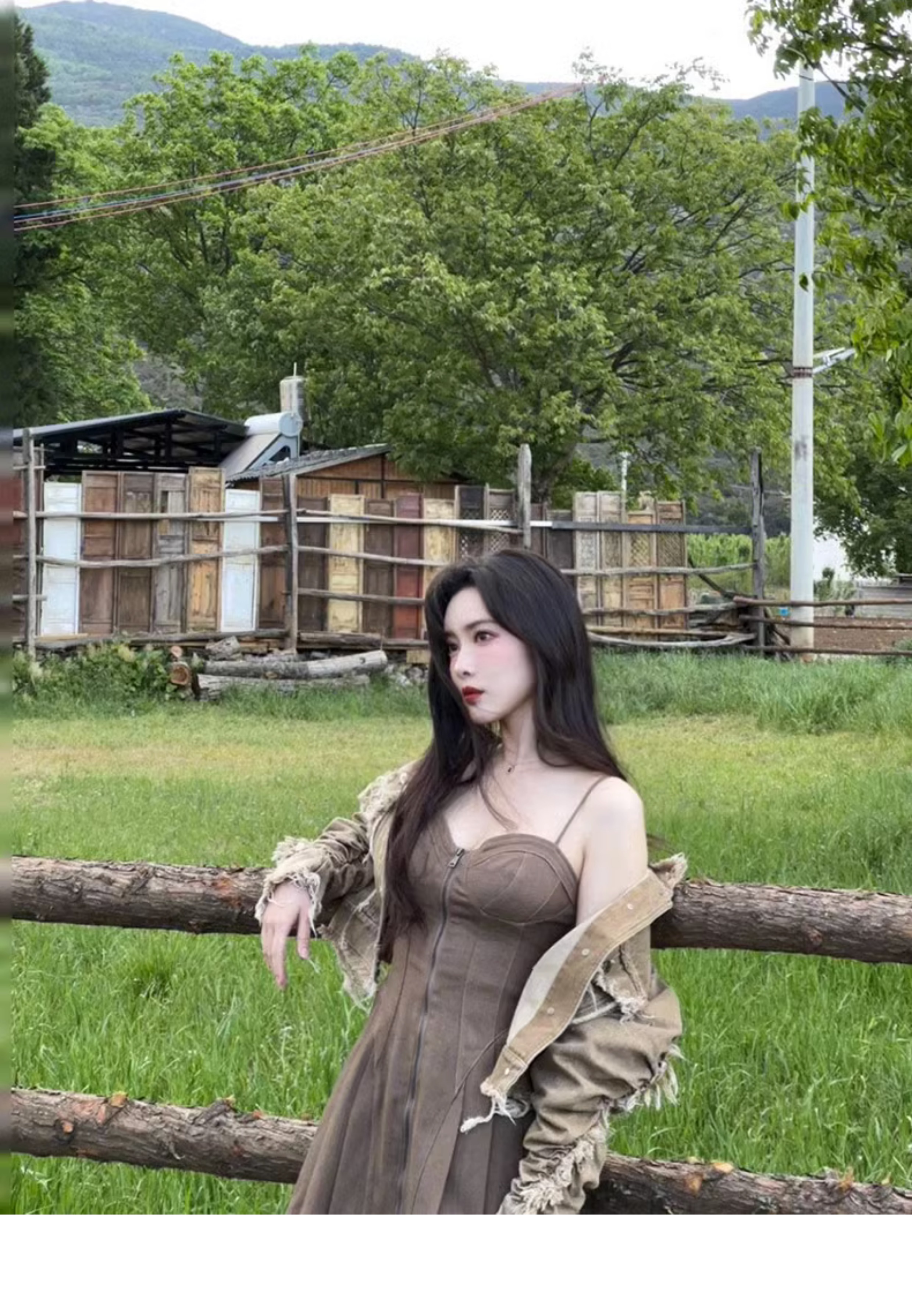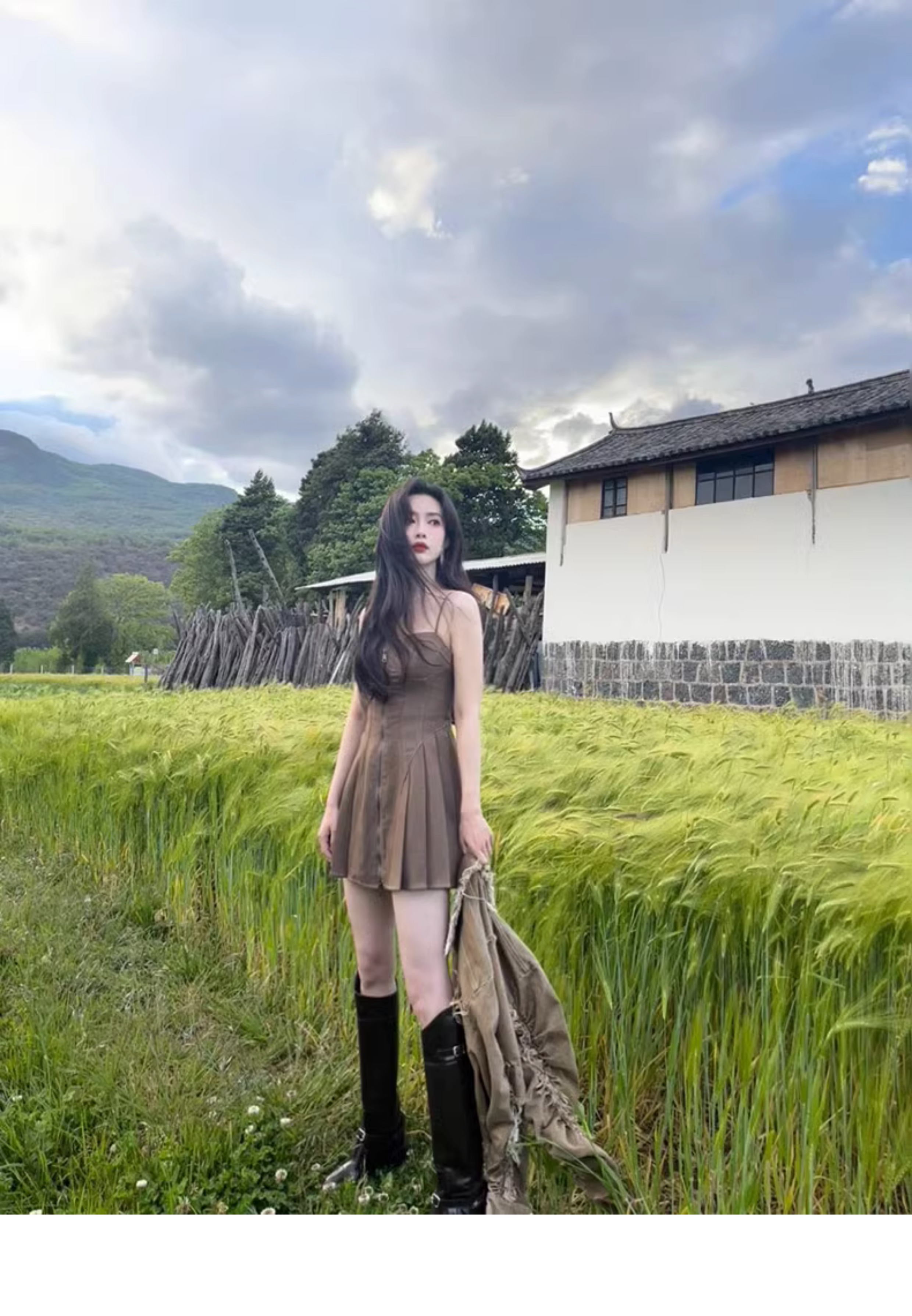 孟子義明星同款咖色綁帶吊帶連衣裙女收腰復古辣妹短裙抹胸a字裙