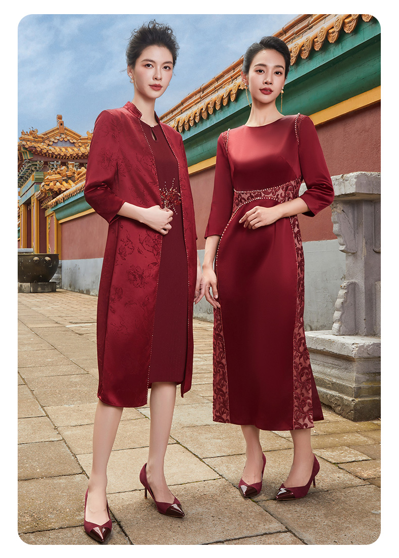 lucre新款喜媽媽秋冬婚宴禮服紅色高級感羊毛醋酸國風上臺連衣裙