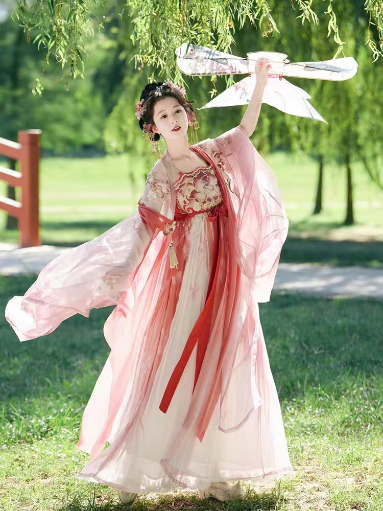 原創漢服女【拒霜芙蓉】唐制刺繡訶子裙大袖衫印花披帛三件套夏款