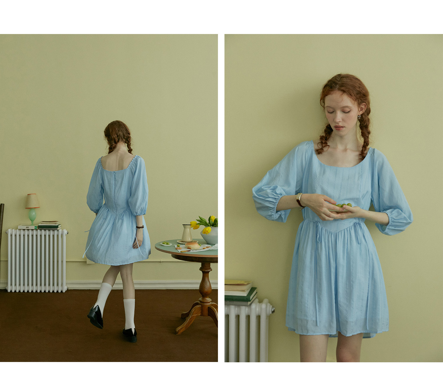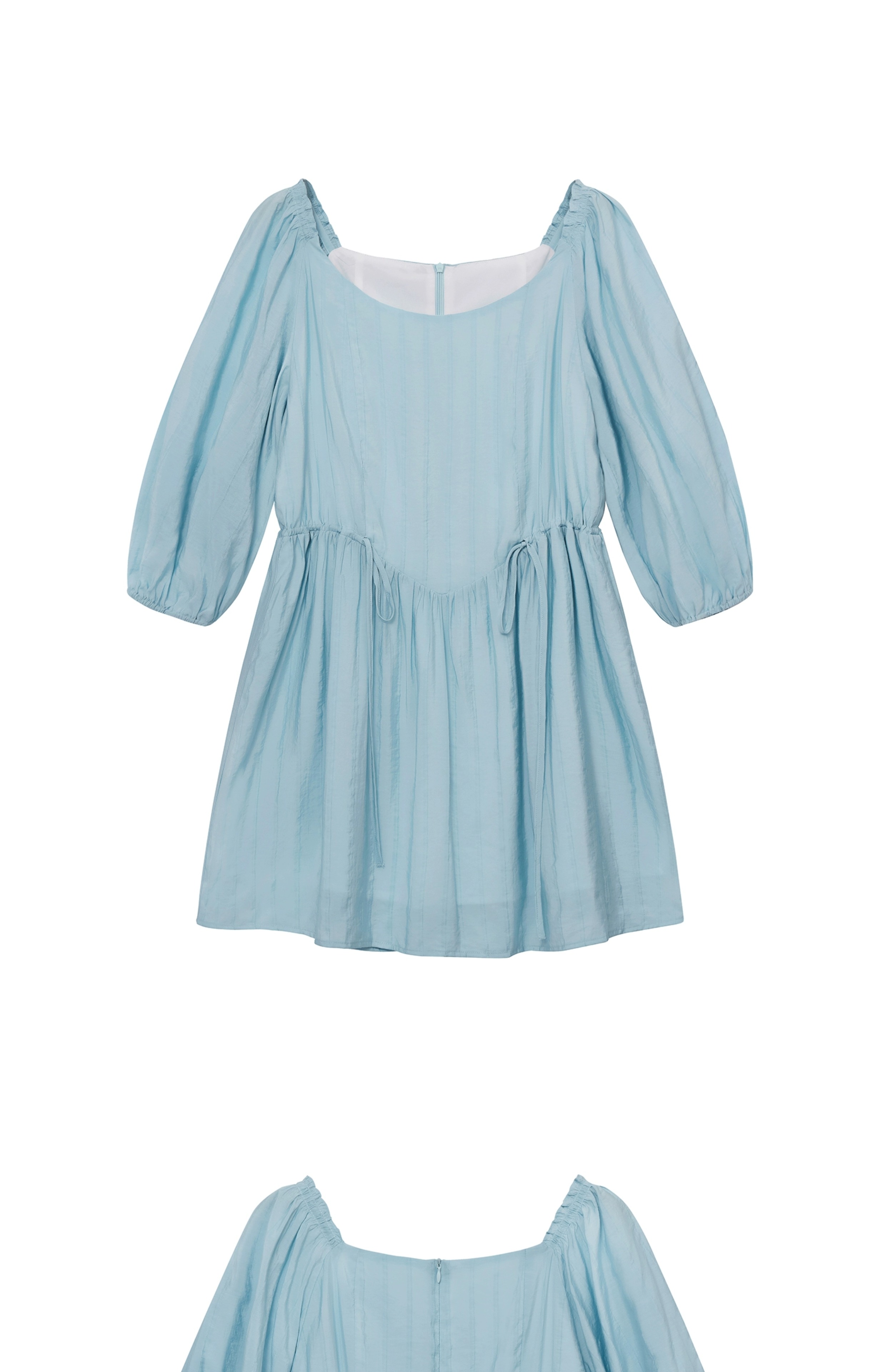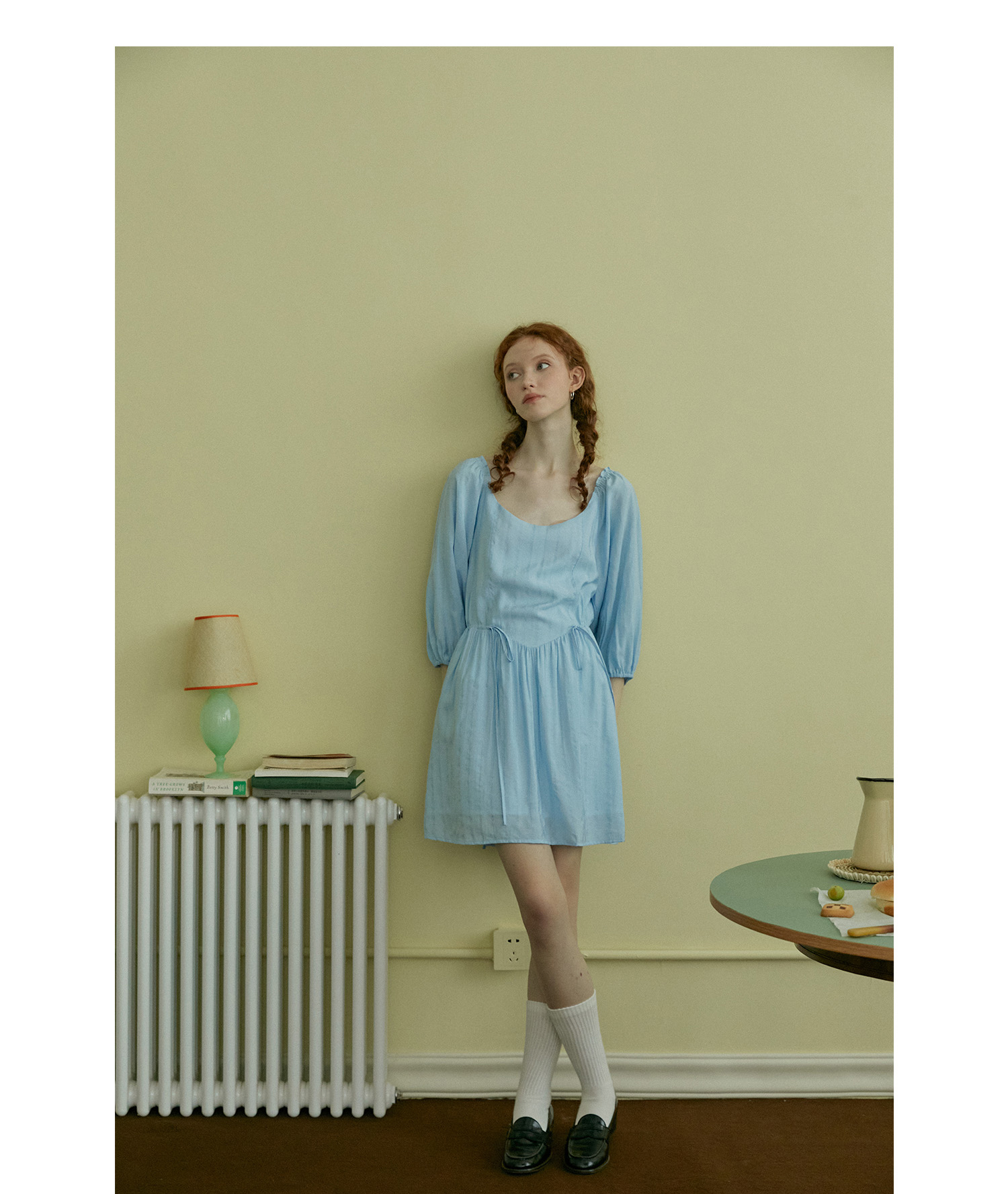 LLANO大圓領收腰綁帶連衣裙復古甜美公主燈籠袖短裙a字中長裙女夏