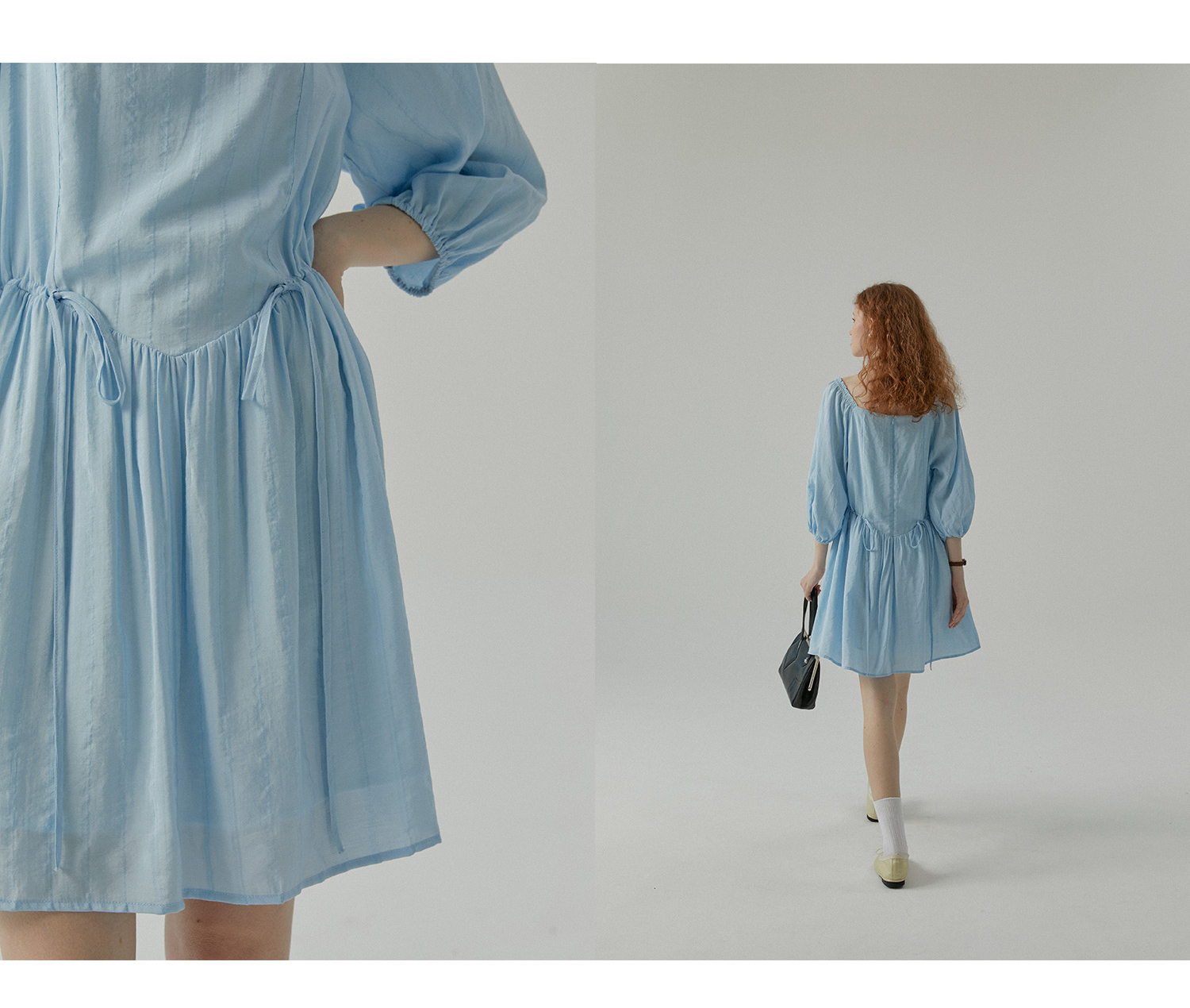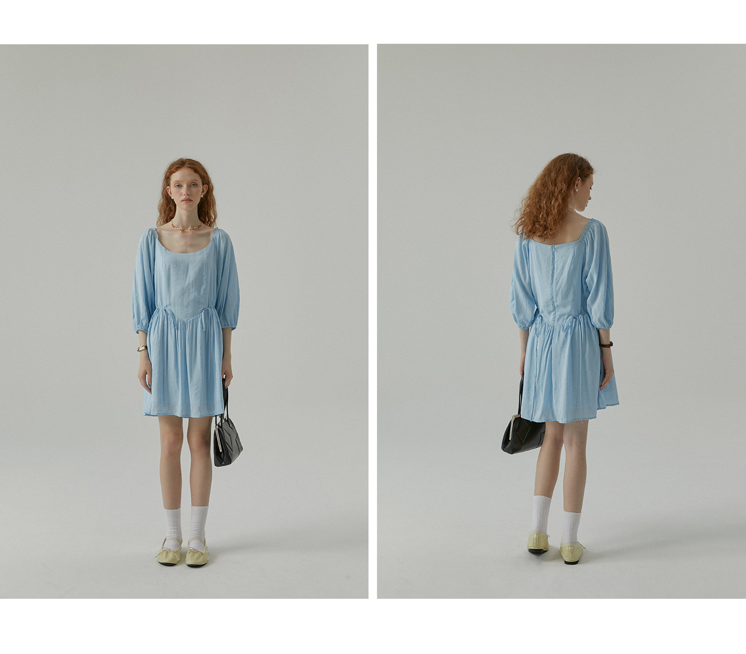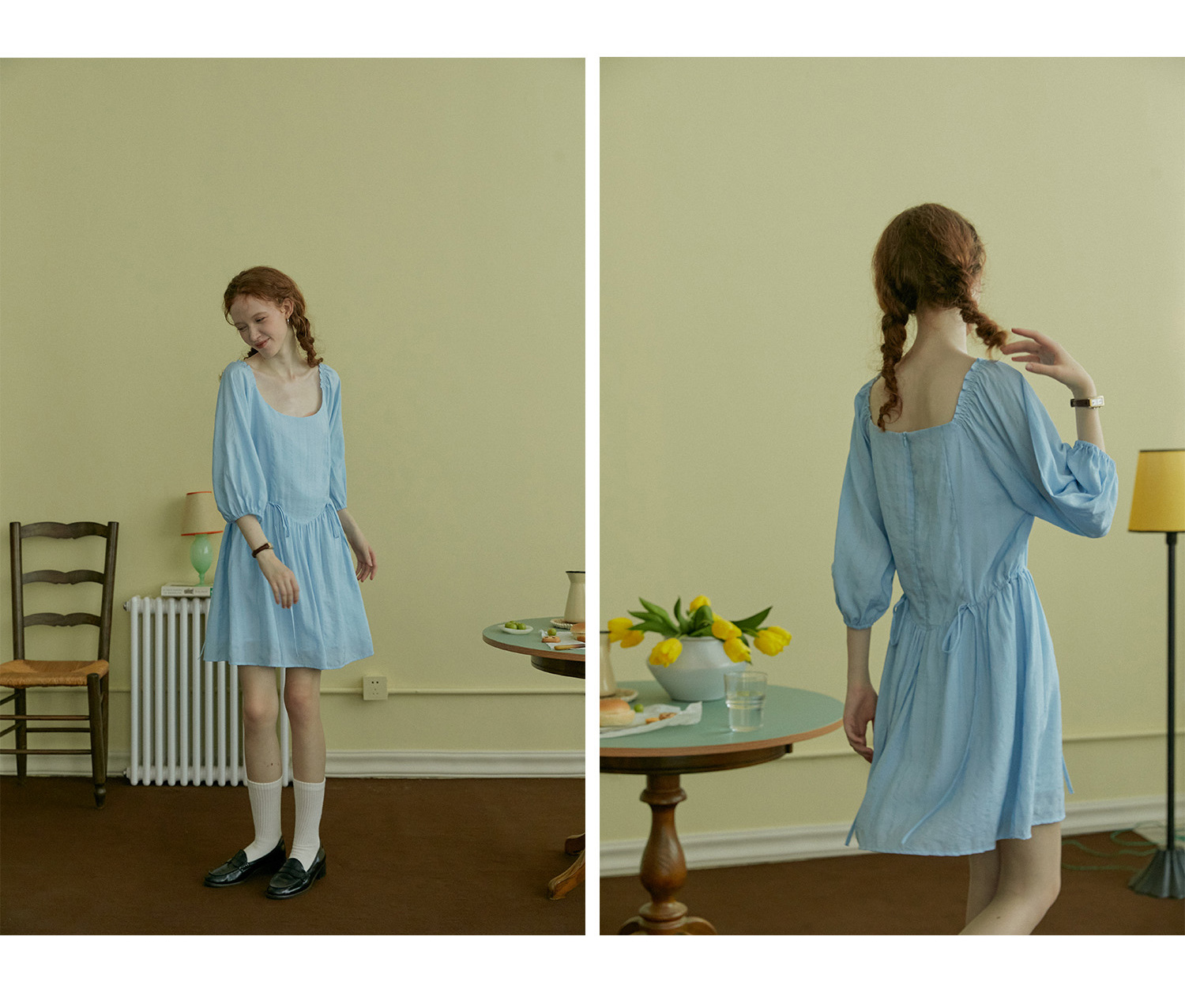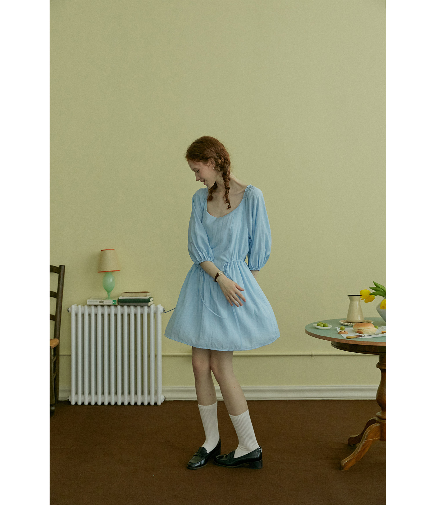 LLANO大圓領收腰綁帶連衣裙復古甜美公主燈籠袖短裙a字中長裙女夏