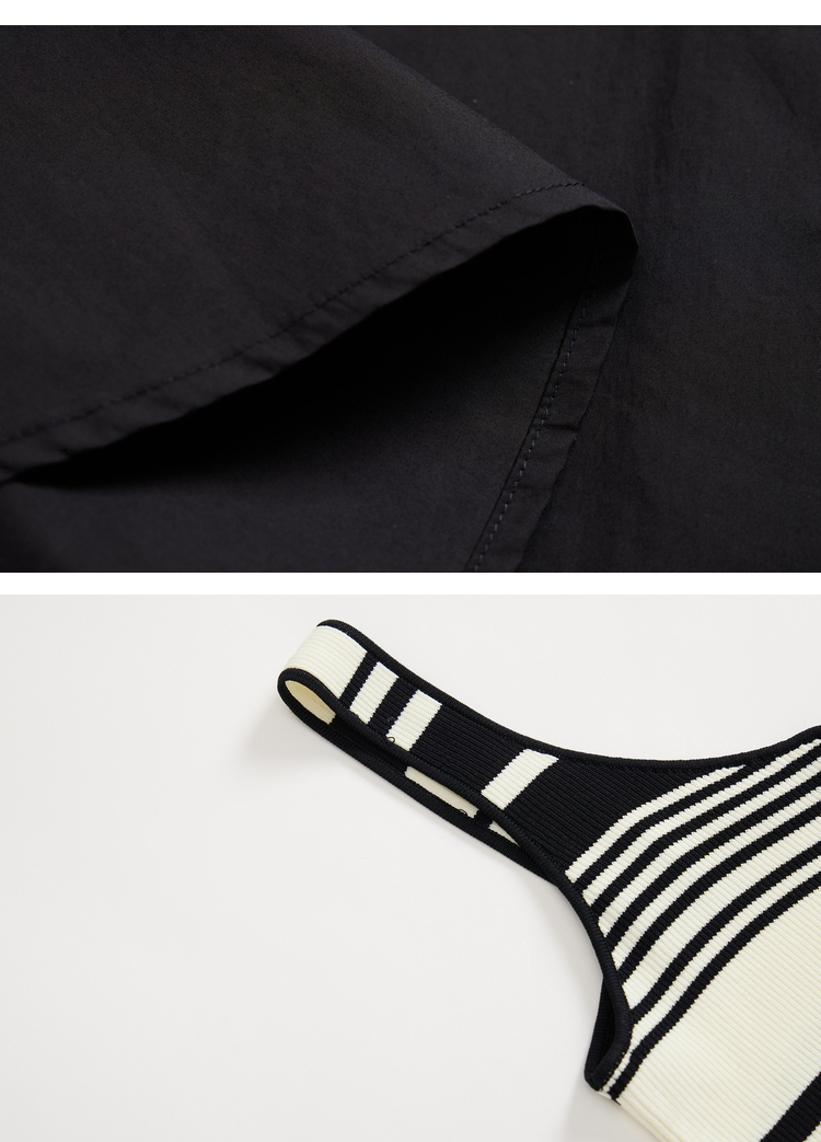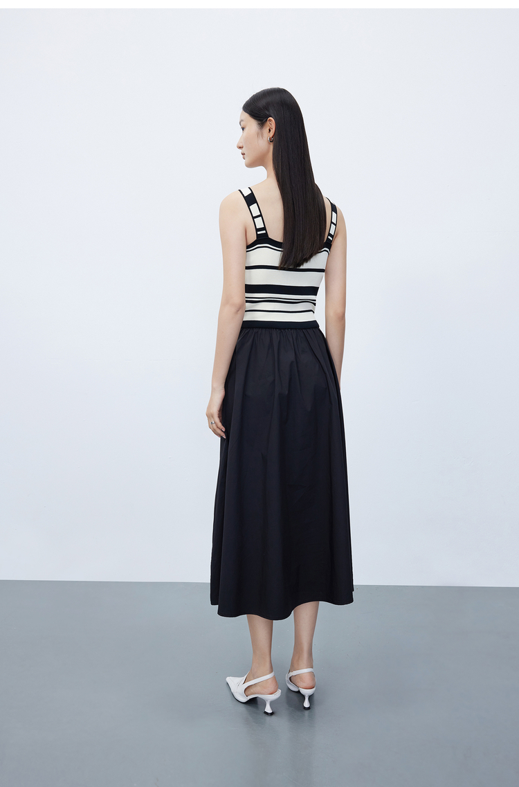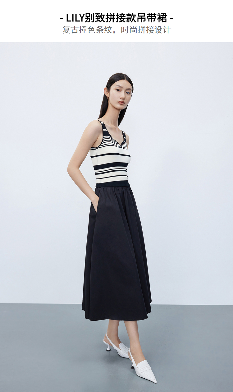 【專柜甄選】LILY2023秋新款女裝拼接復古條紋吊帶連衣裙小黑裙女