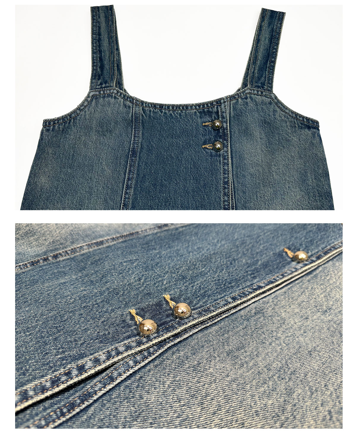 SOMESOWE【2023春夏】復古抽繩牛仔背帶裙女高腰小個子開叉連衣裙