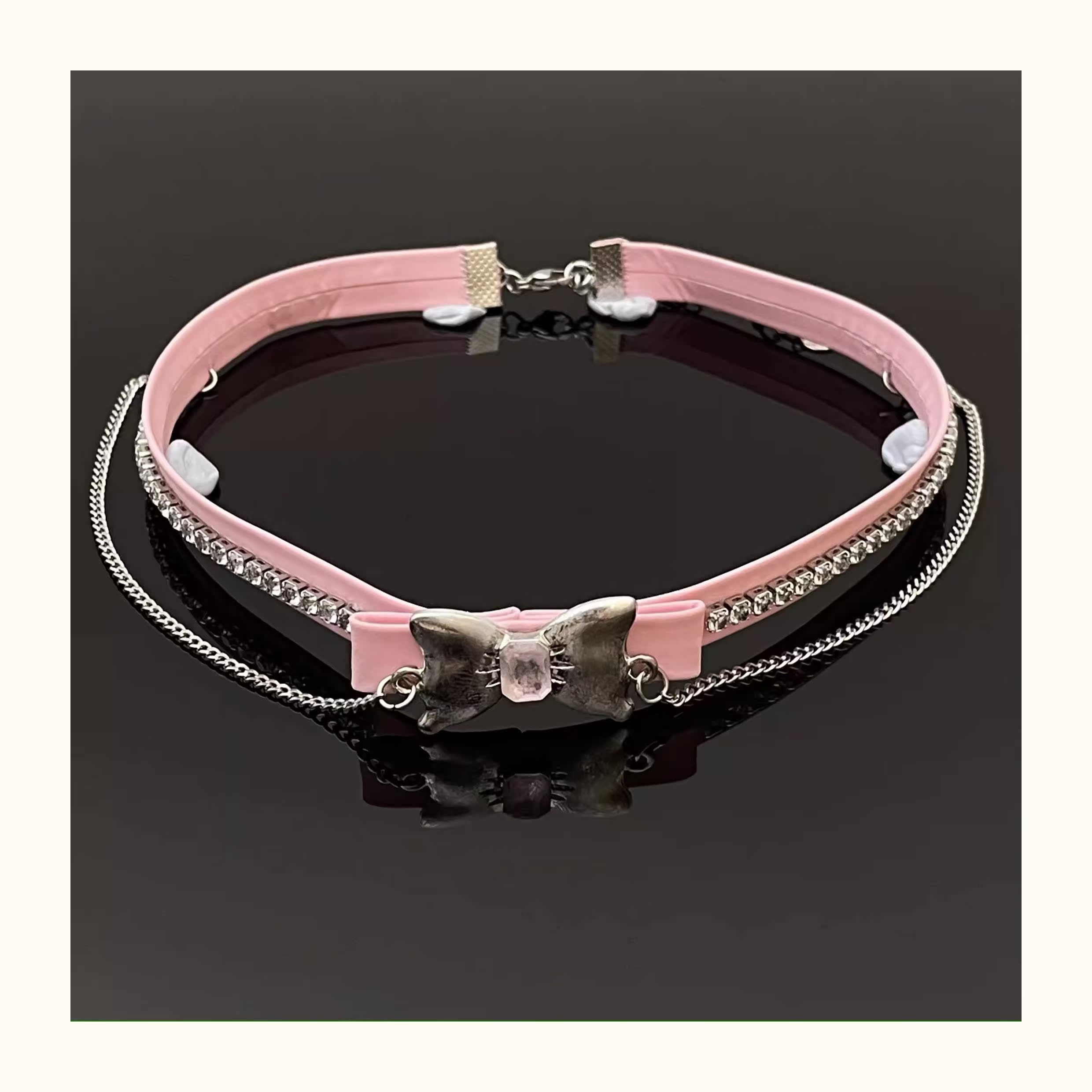 粉色蝴蝶皮革項圈復古辣妹choker甜酷y2k小眾百搭鎖骨鏈多巴胺
