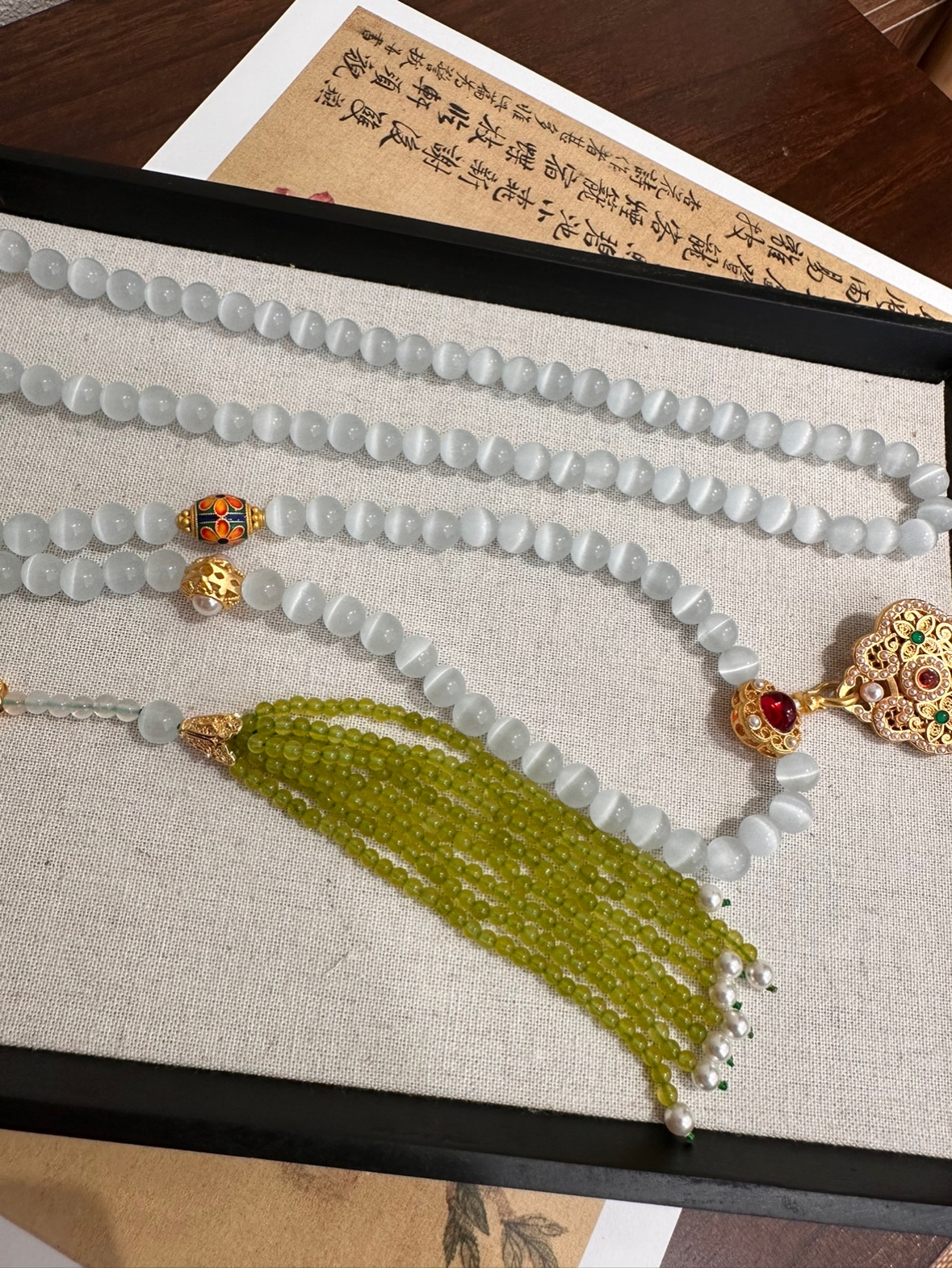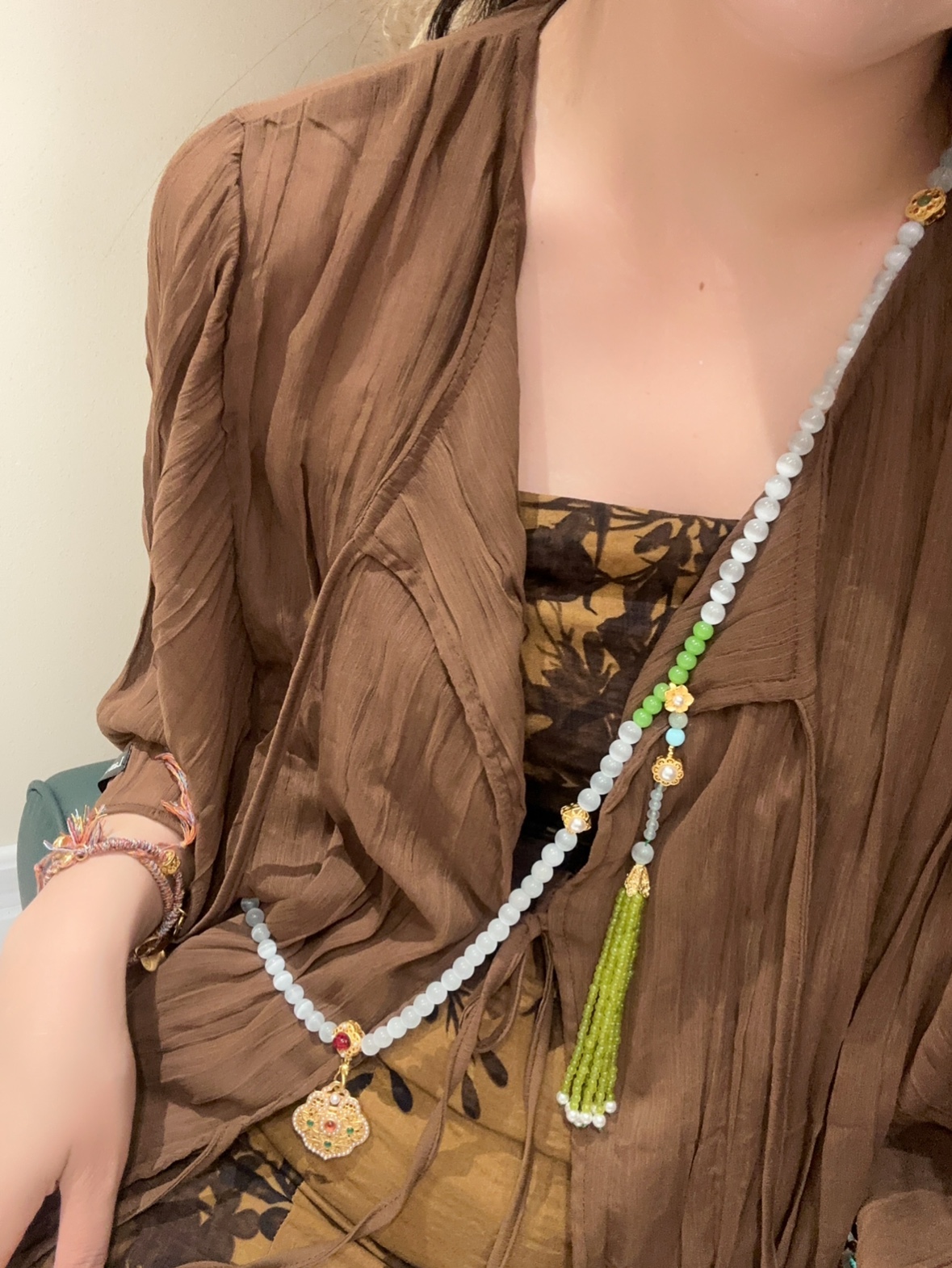 龍紋貝母青綠新中式原創斜挎項鏈多用多層綠松石淡水珍珠一款多戴