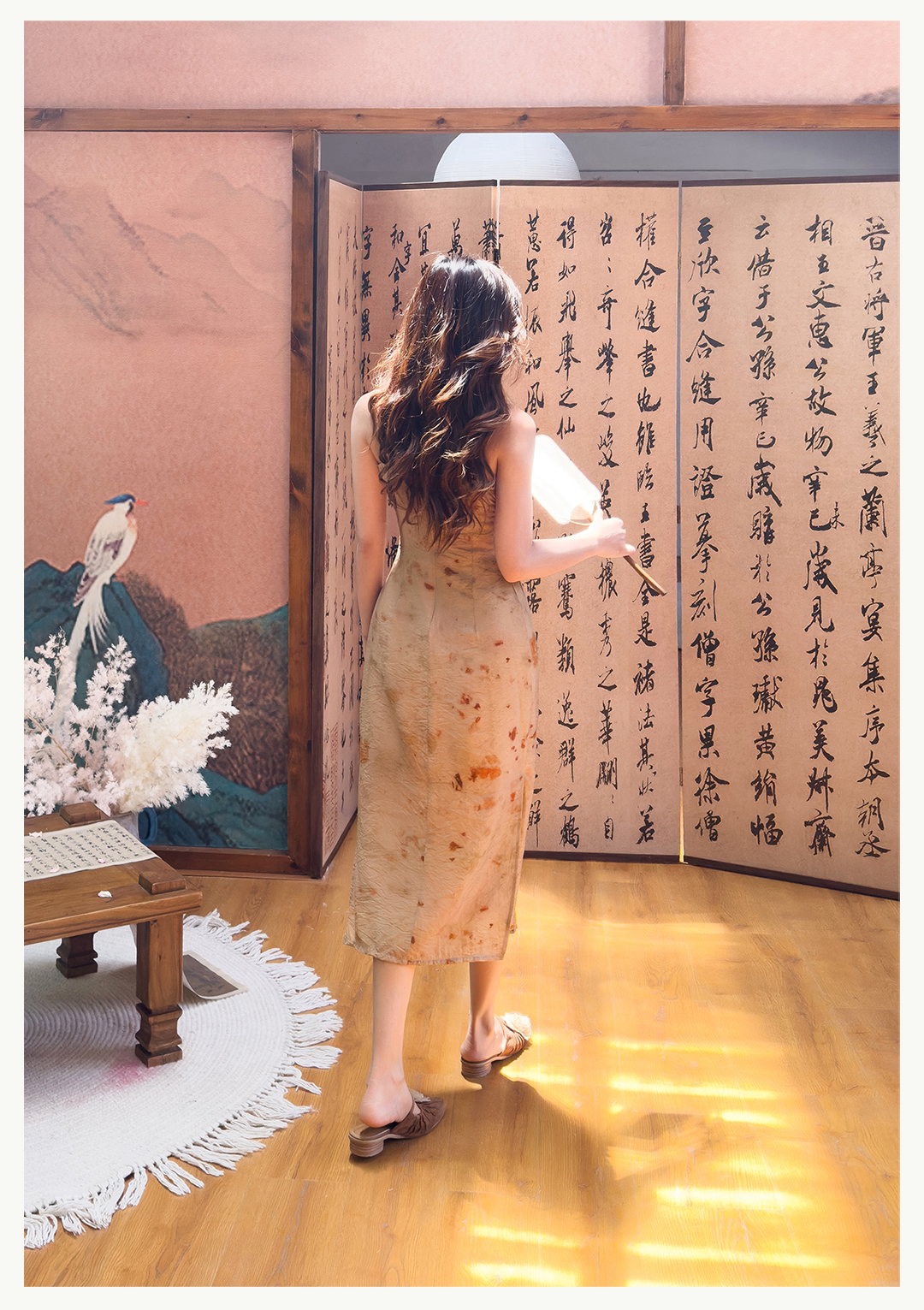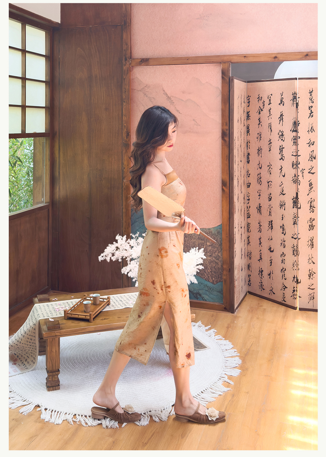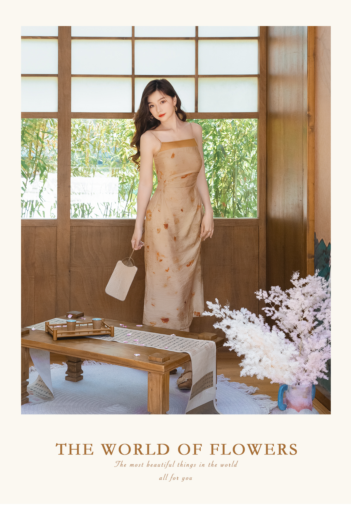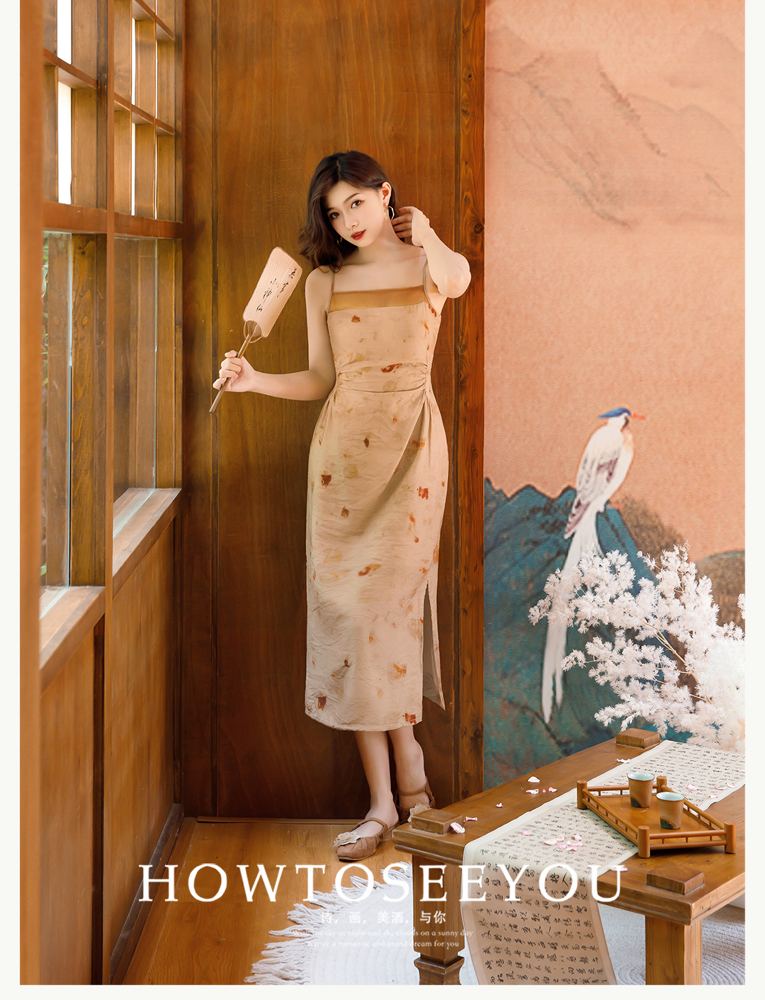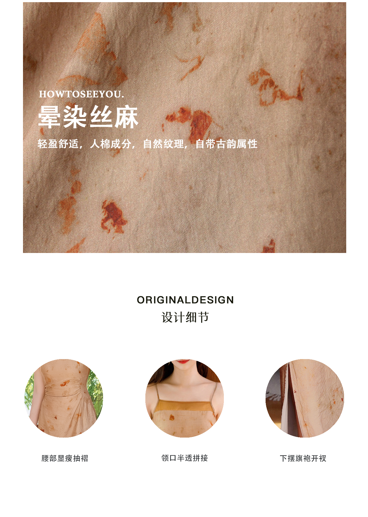 何衣見友《迷月》新中式暈染肌理天絲抽褶開叉吊帶連衣裙兩件套裝