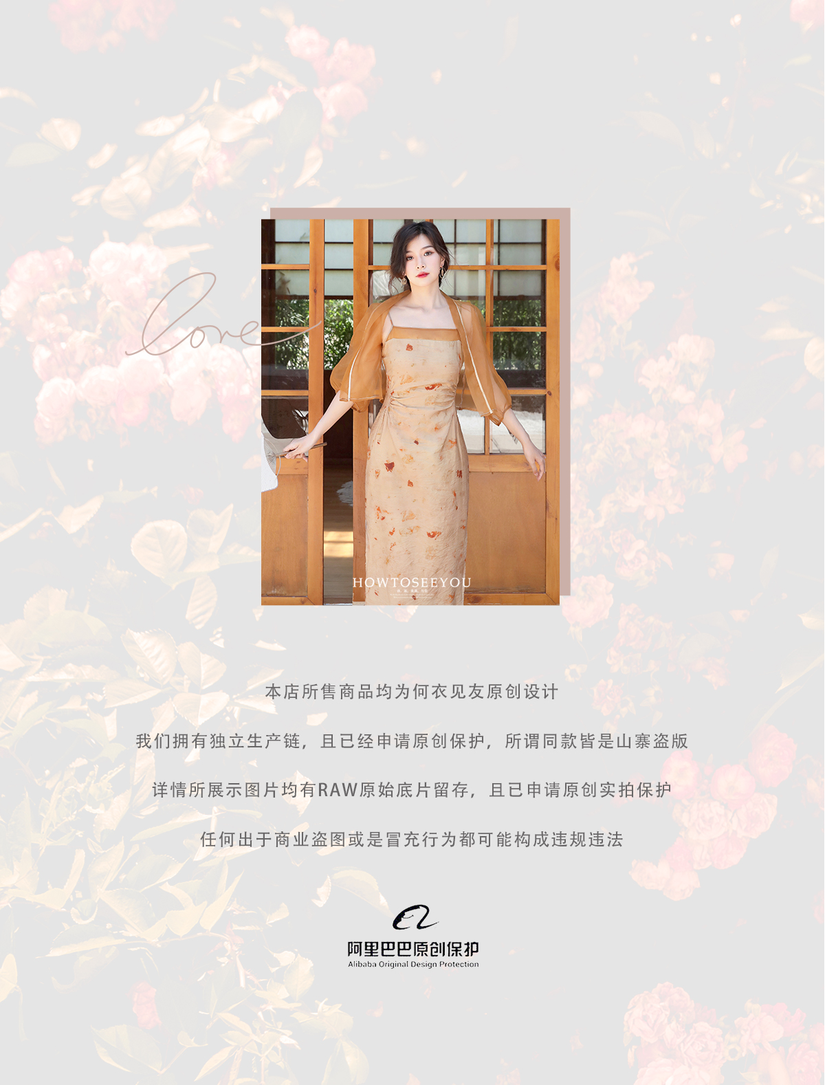 何衣見友《杜鵑》新中式緞面暗紋提花開叉吊帶開衫連衣裙兩件套裝