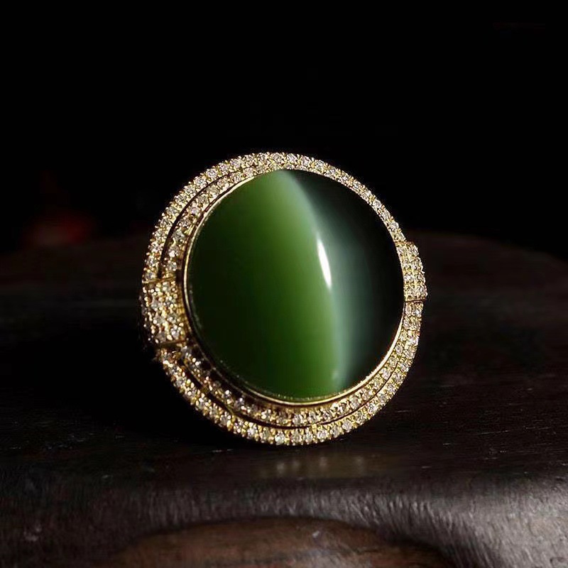 S925銀鑲嵌和田玉碧玉貓眼石戒指女高貴復古典雅奢華開口指環