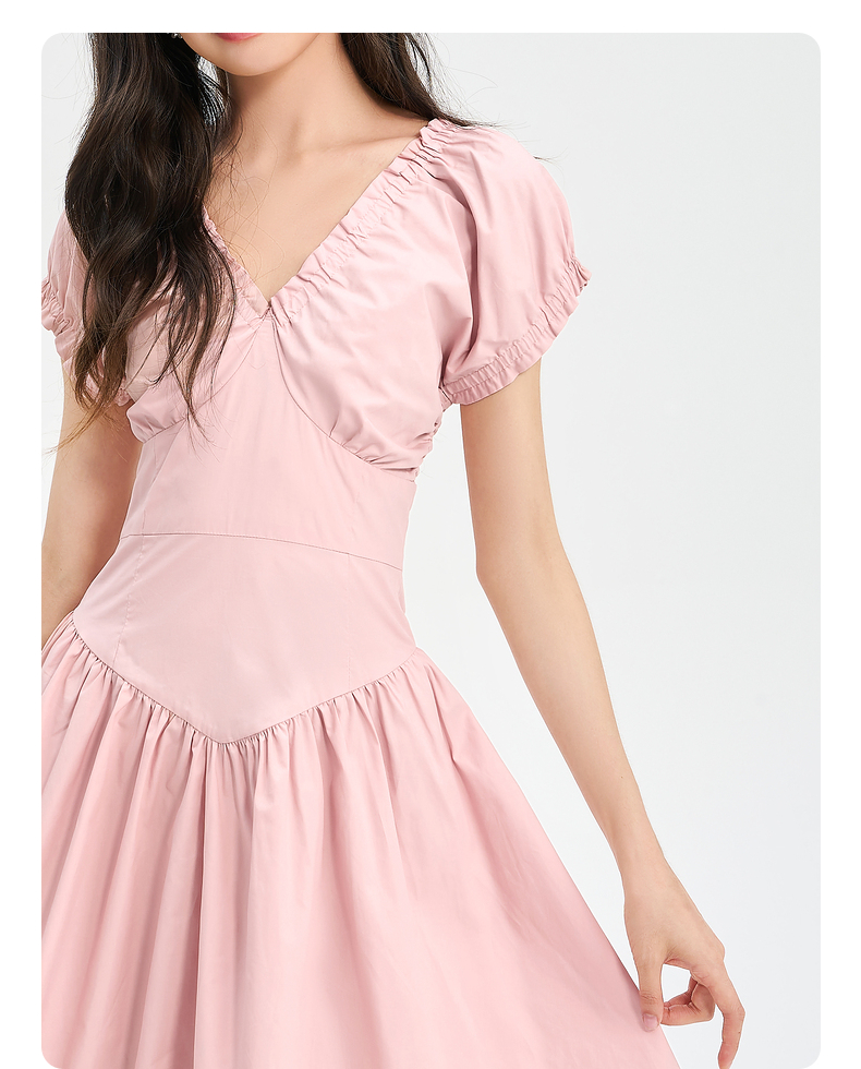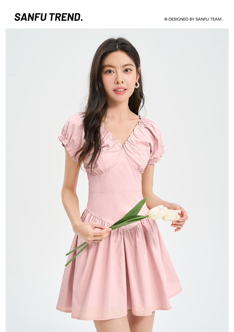 三福連衣裙2023甜美木耳邊V領收腰純欲氣質裙子女裝474779