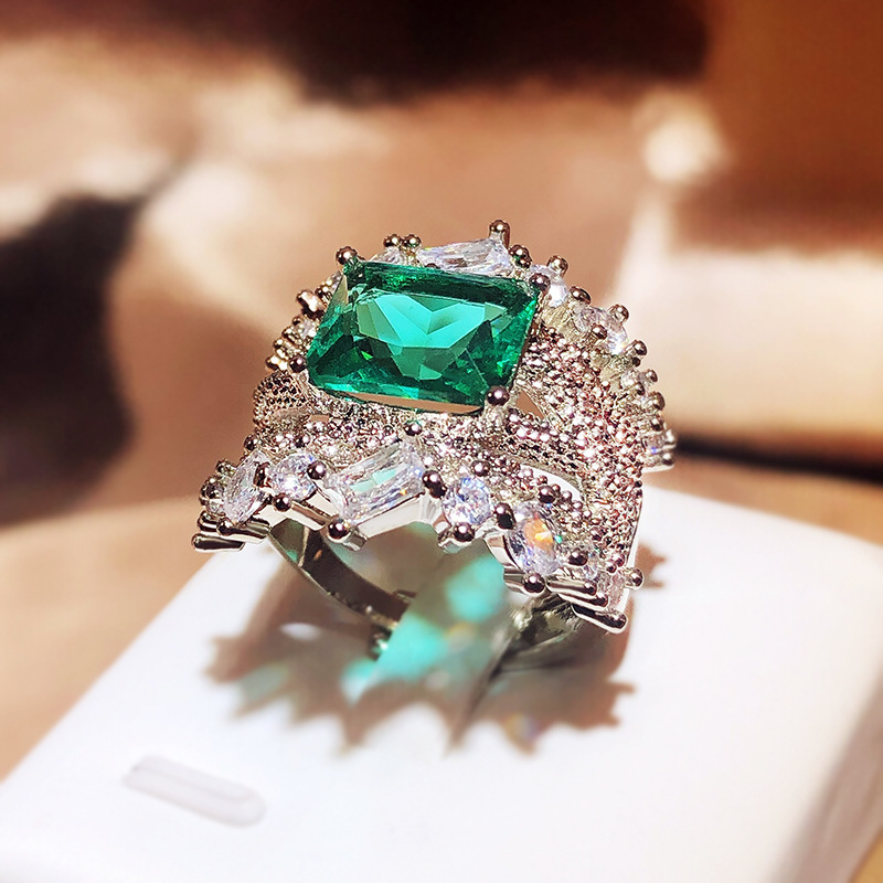 vintage歐美輕奢風璀璨方形祖母綠訂婚戒指手飾大氣豪華女士指環
