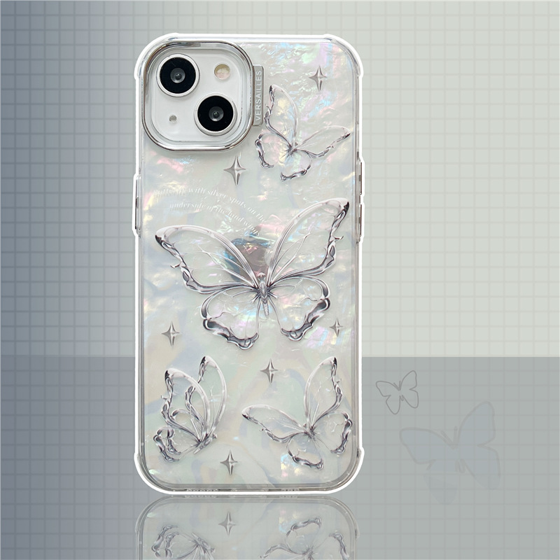 iPhone14ProMax手機殼適用12蘋果13全包邊鏡頭防摔保護套貝殼紋金屬感四只蝴蝶小香風夢幻唯美女生背夾長掛繩