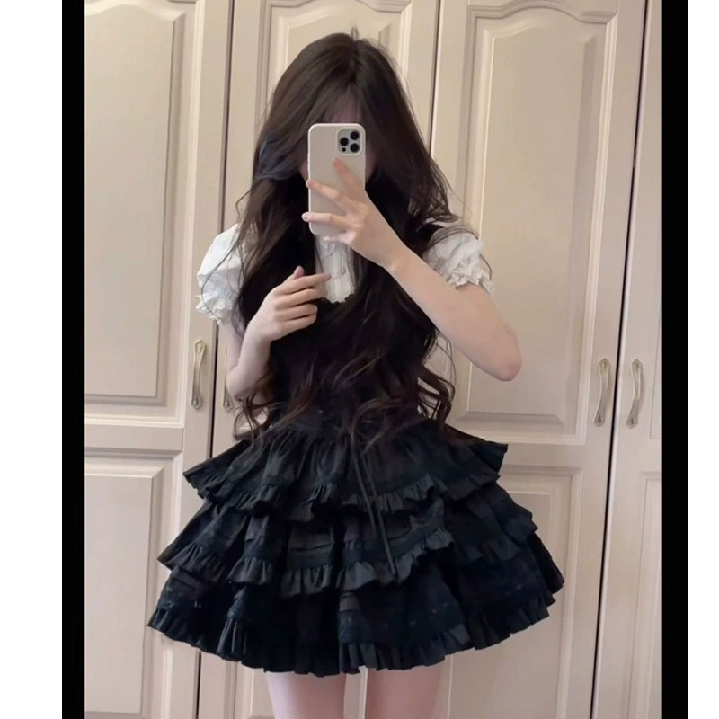 夏季套裝裙甜美蕾絲襯衣短袖上衣黑色吊帶裙公主裙蘿莉蛋糕蓬蓬裙