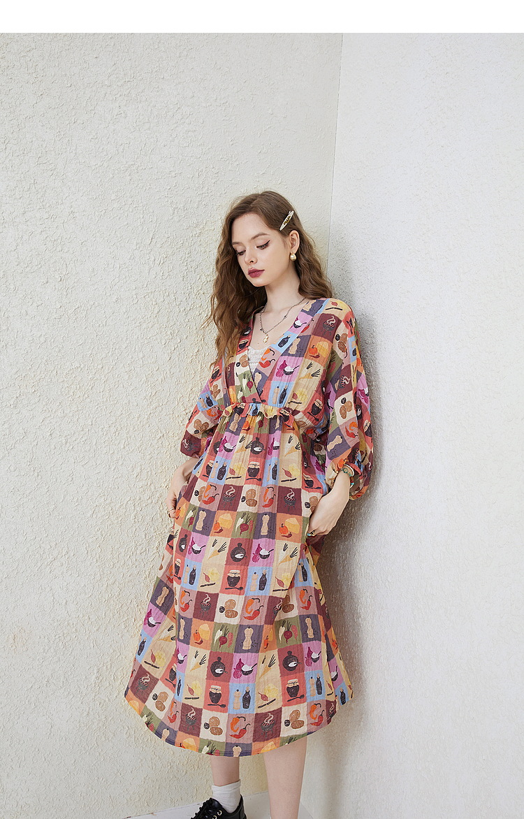妖精的口袋兩件套印花連衣裙女2023夏季新款v領高腰薄款寬松裙子