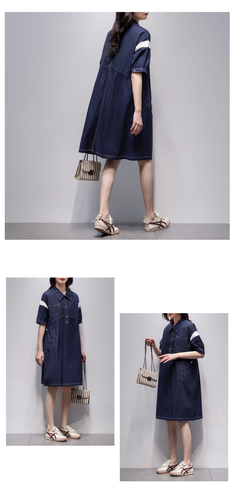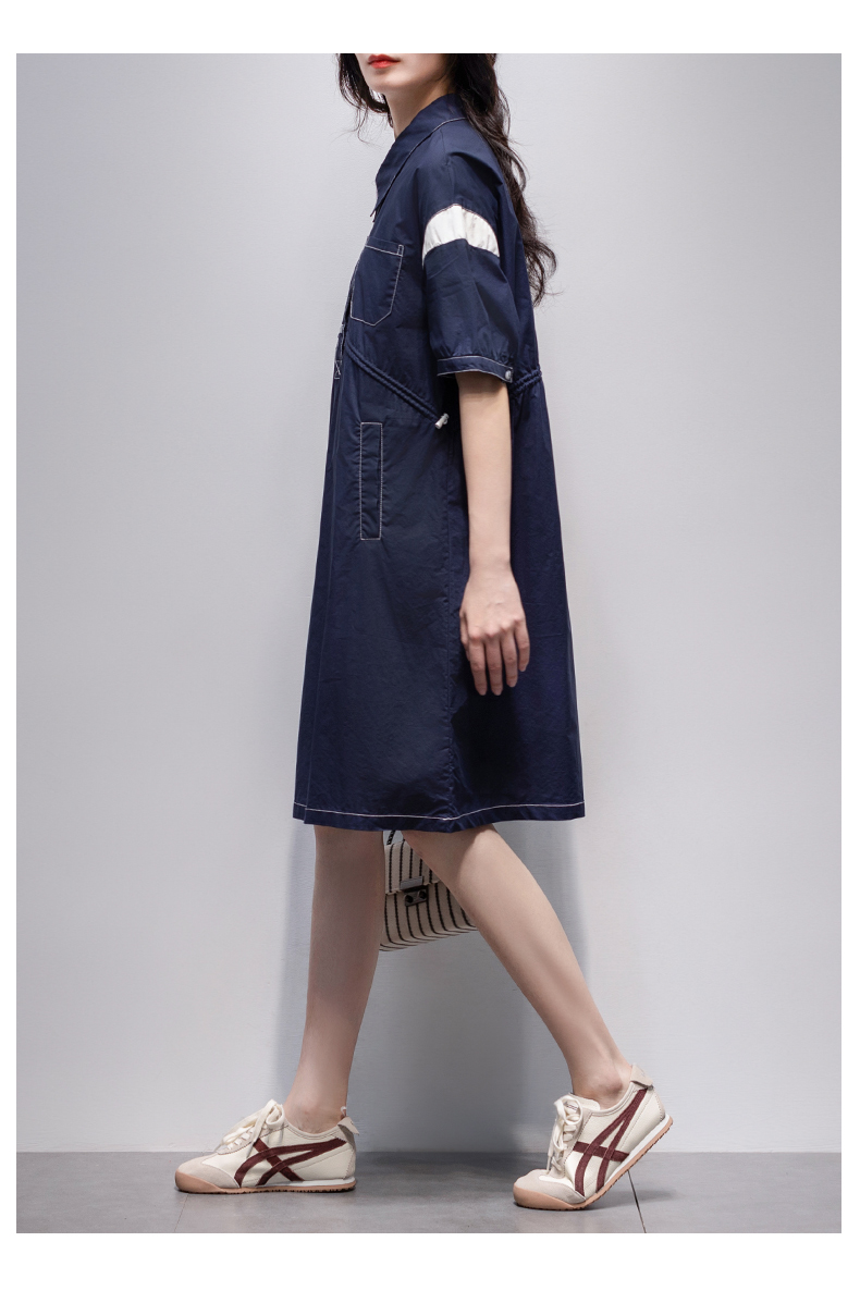 藏青色短袖襯衫裙女2023夏季新款韓版POLO領百搭顯瘦中長款連衣裙
