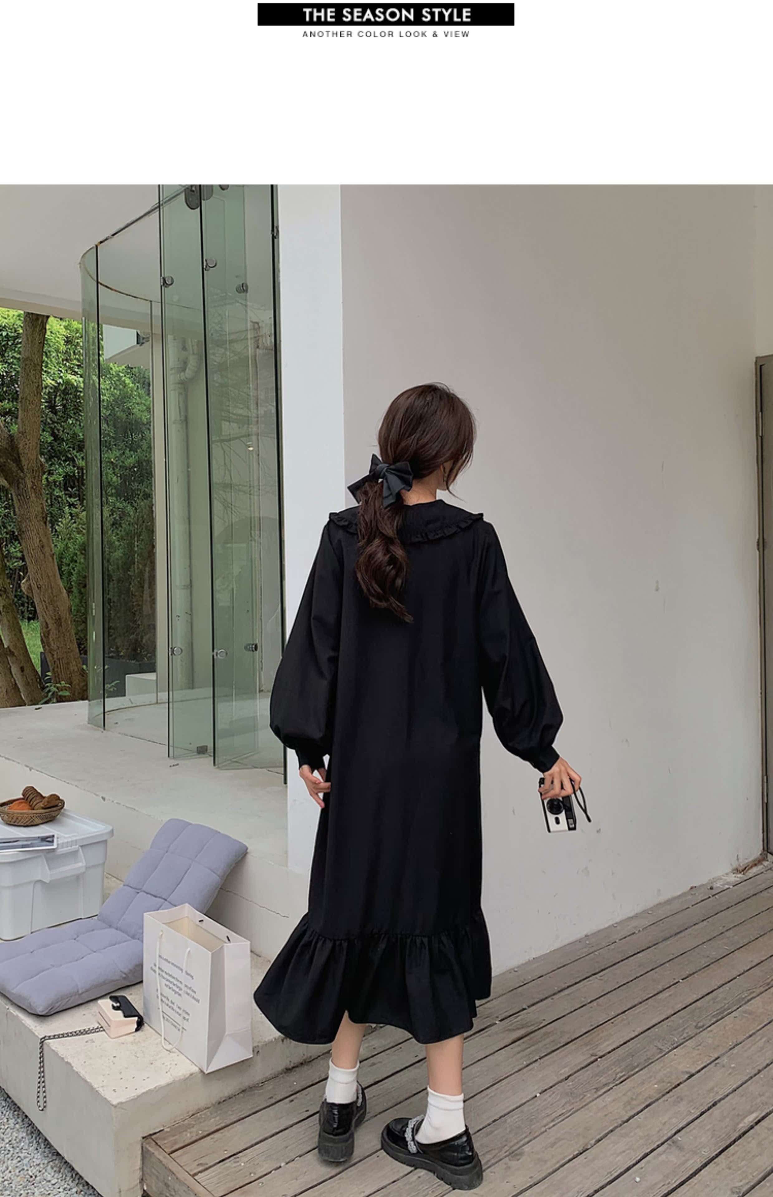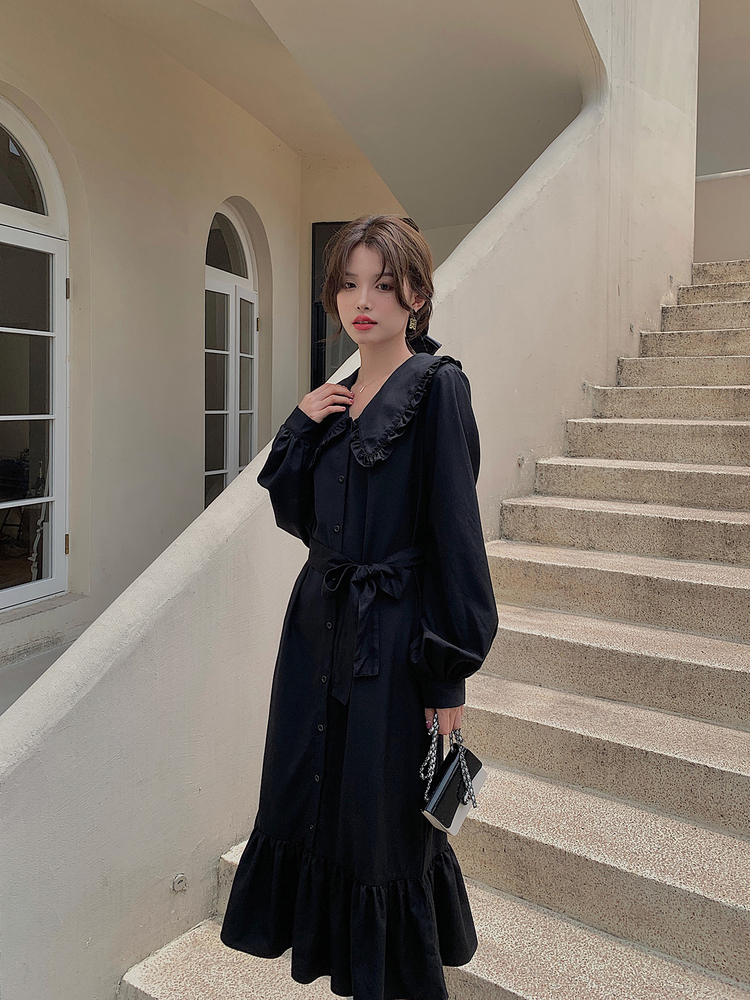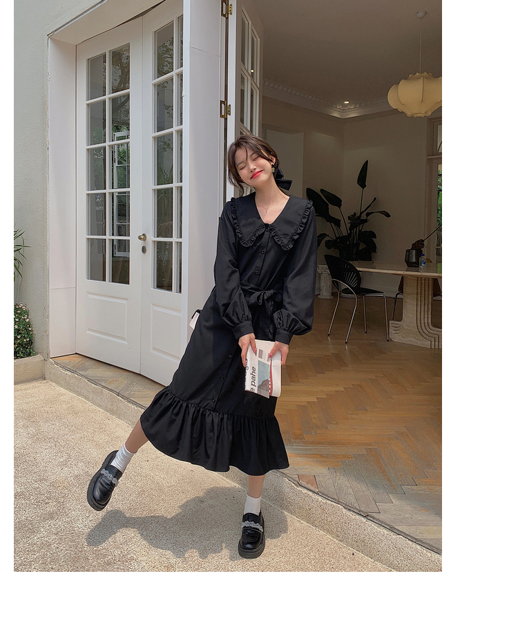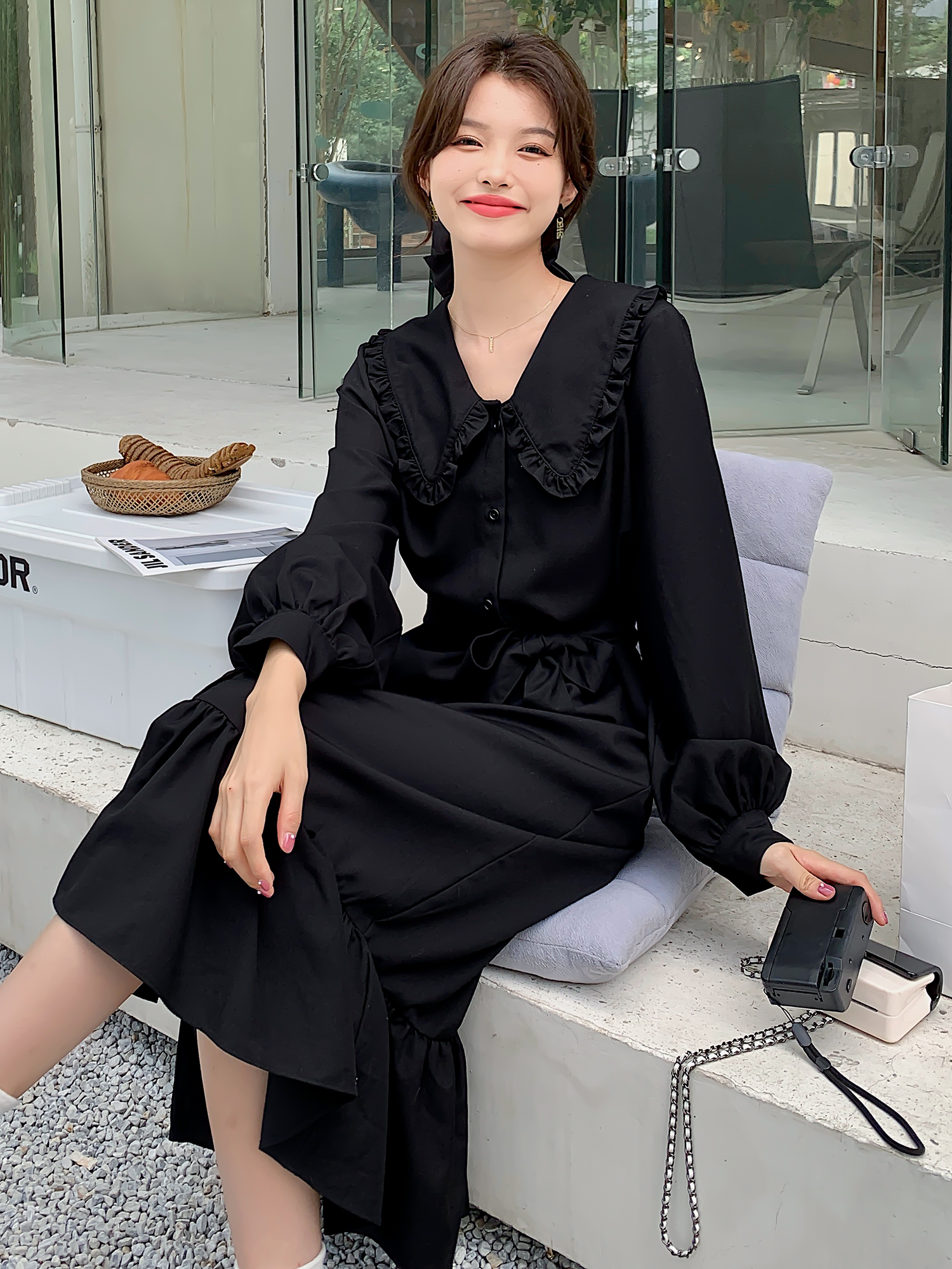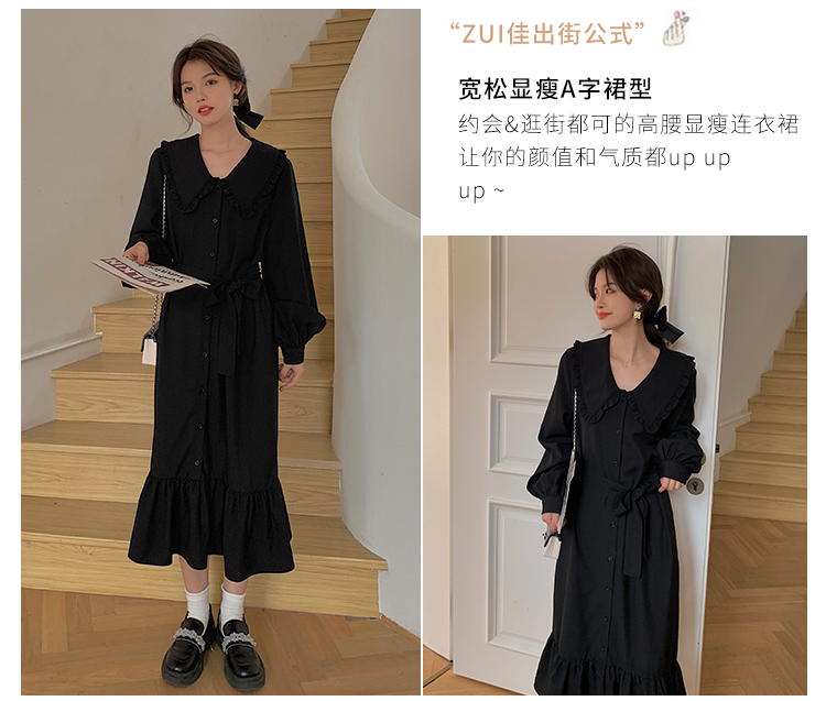 喬覓黑色娃娃領長袖連衣裙女春秋2023新款法式溫柔風收腰顯瘦長裙