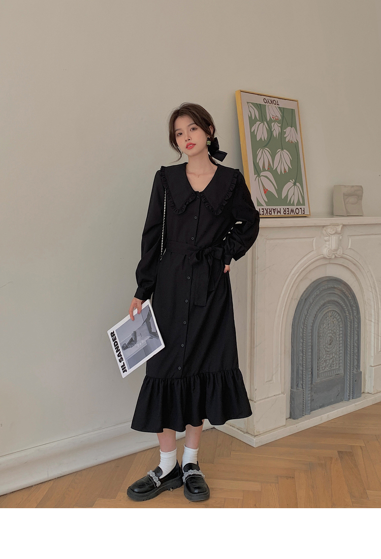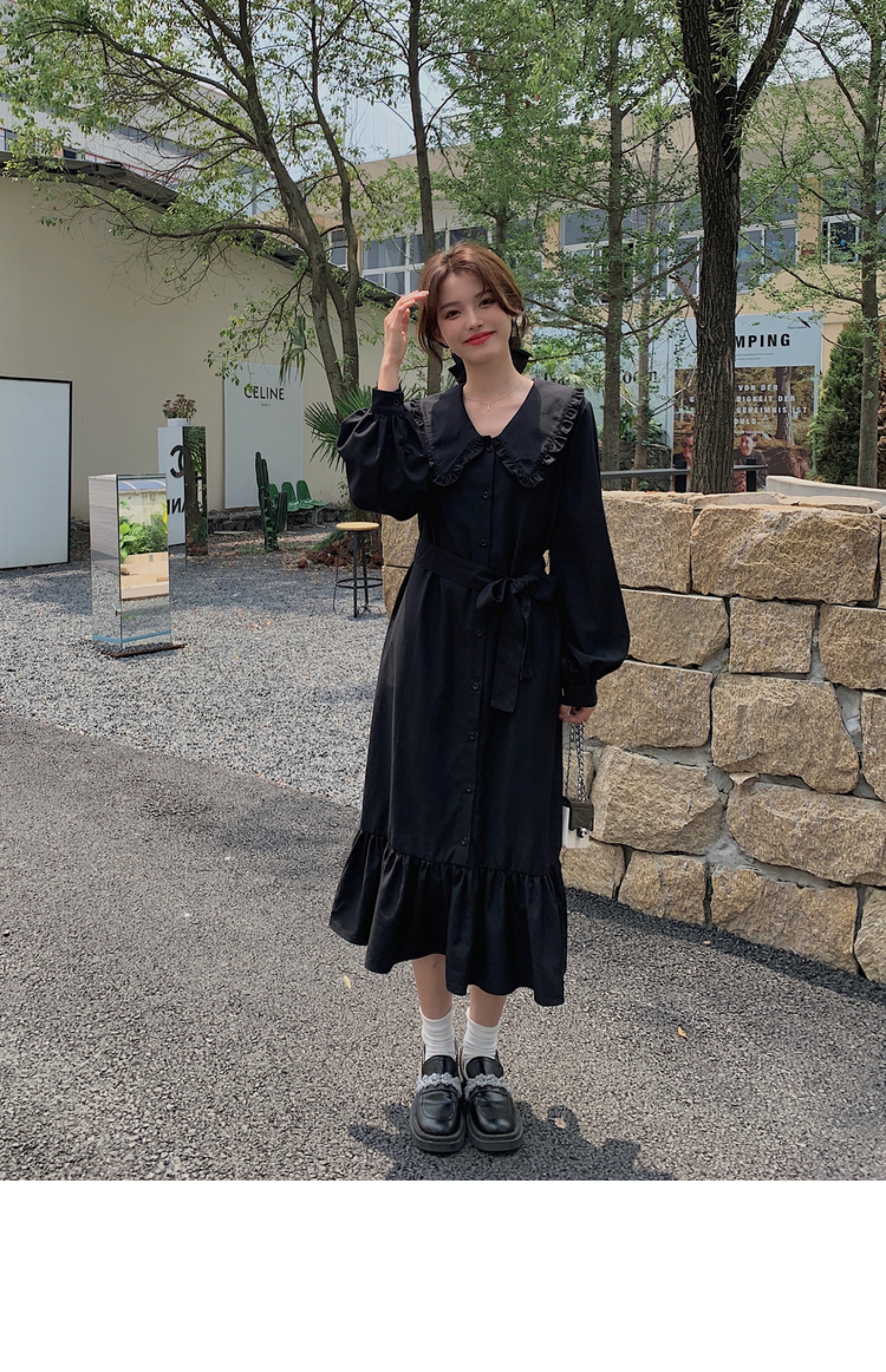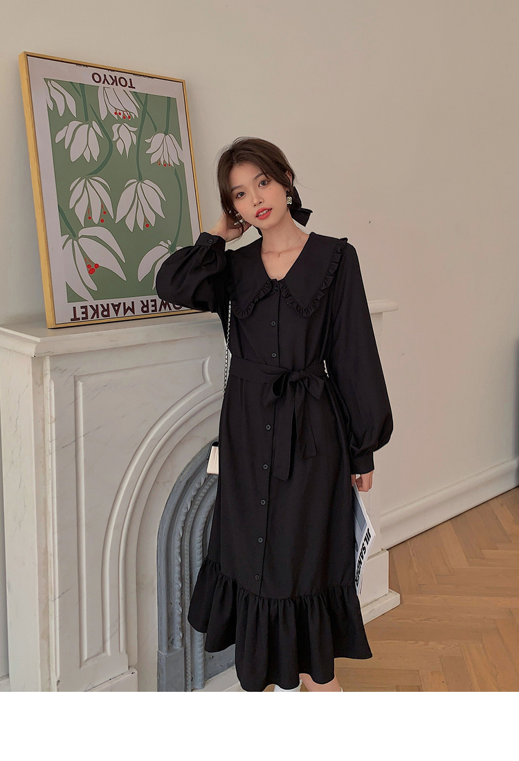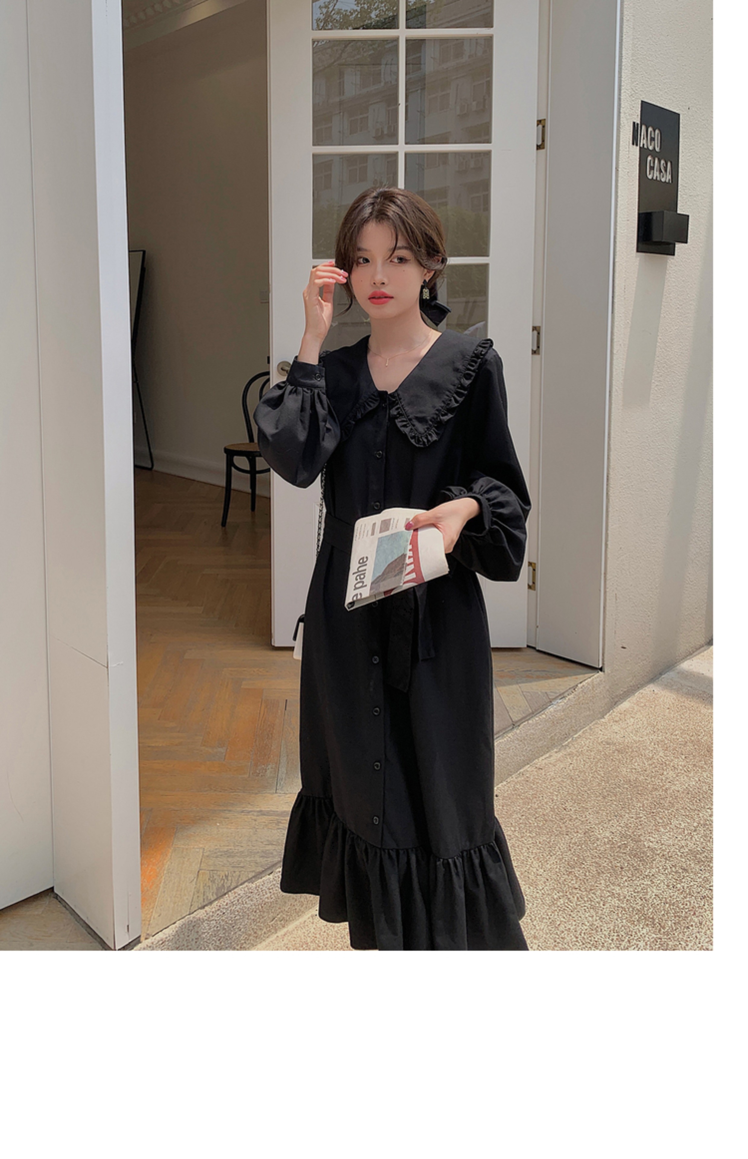 喬覓黑色娃娃領長袖連衣裙女春秋2023新款法式溫柔風收腰顯瘦長裙
