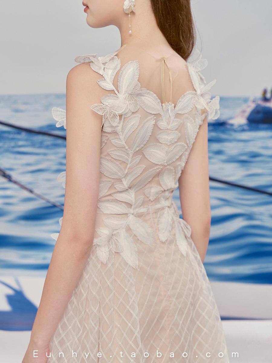 越南小眾ROSSDEMATIN 2023年夏季新款純白仙氣枝葉格紋連衣裙