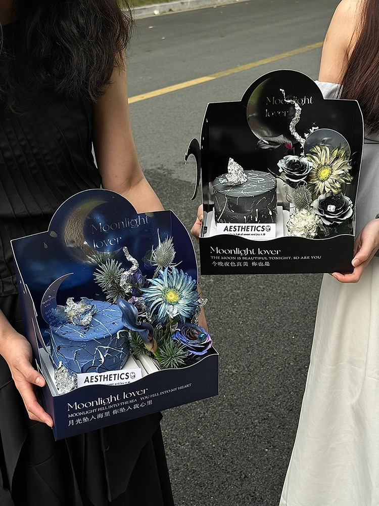 網紅七夕情人節蛋糕裝飾月光愛人浪漫宇宙款鮮花蛋糕盒手提包裝盒
