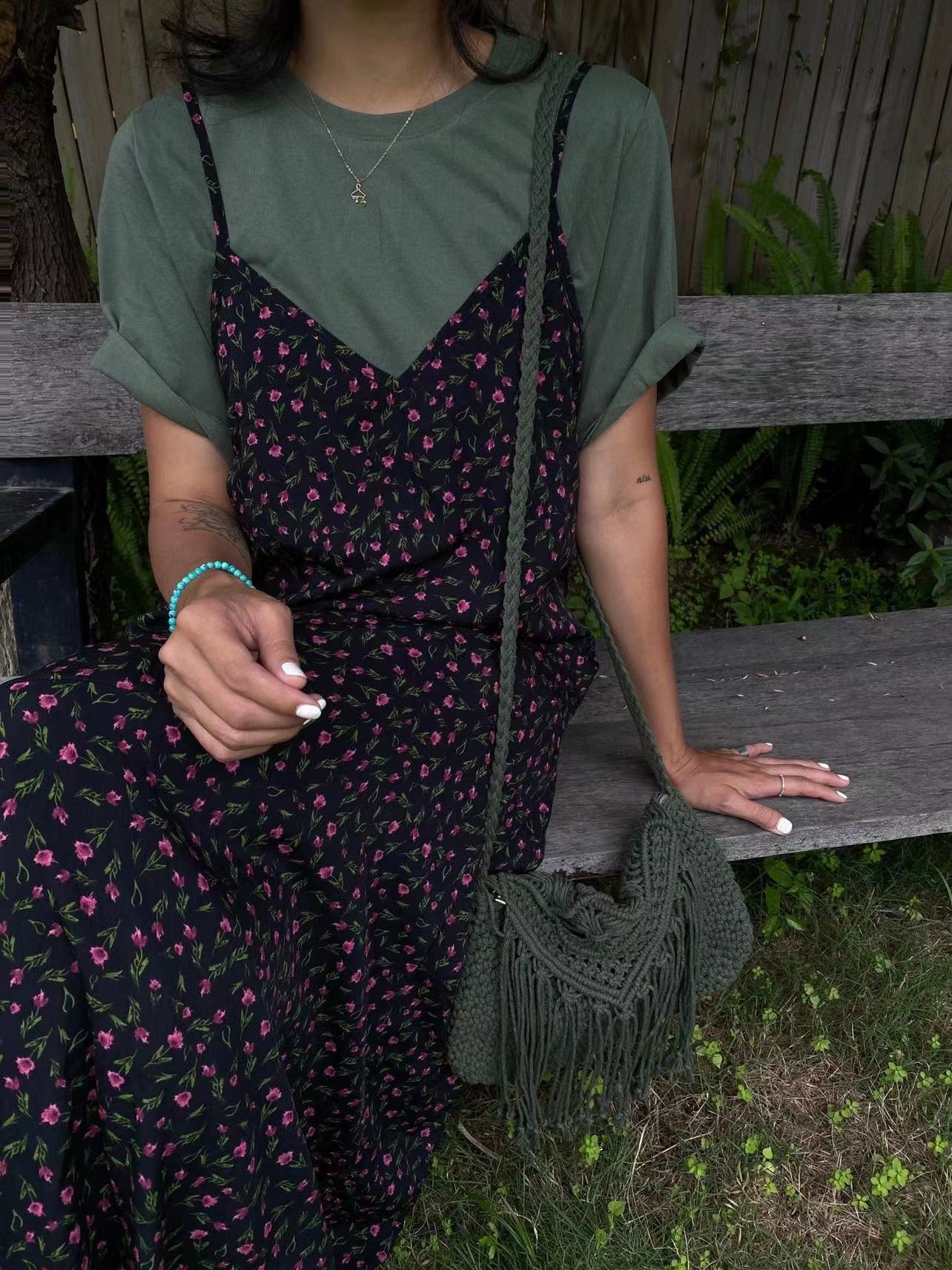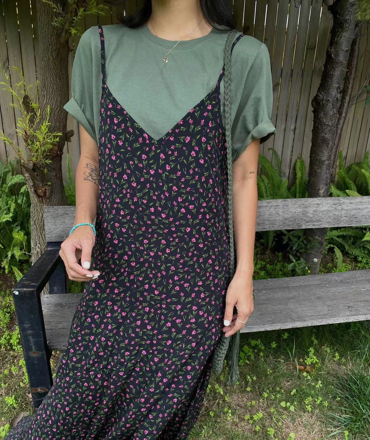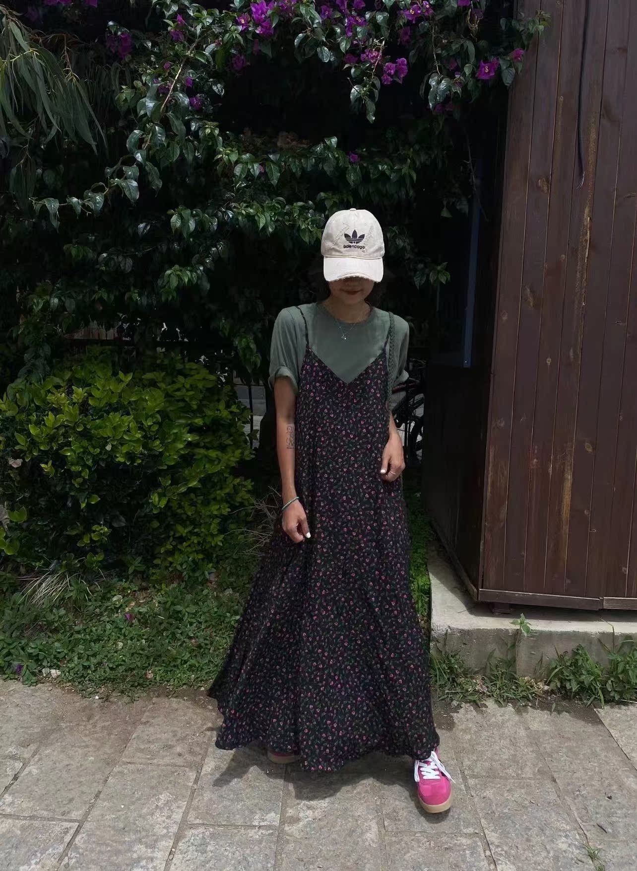 2023秋季one seven新款時尚寬松顯瘦魚尾長裙碎花吊帶裙連衣裙女