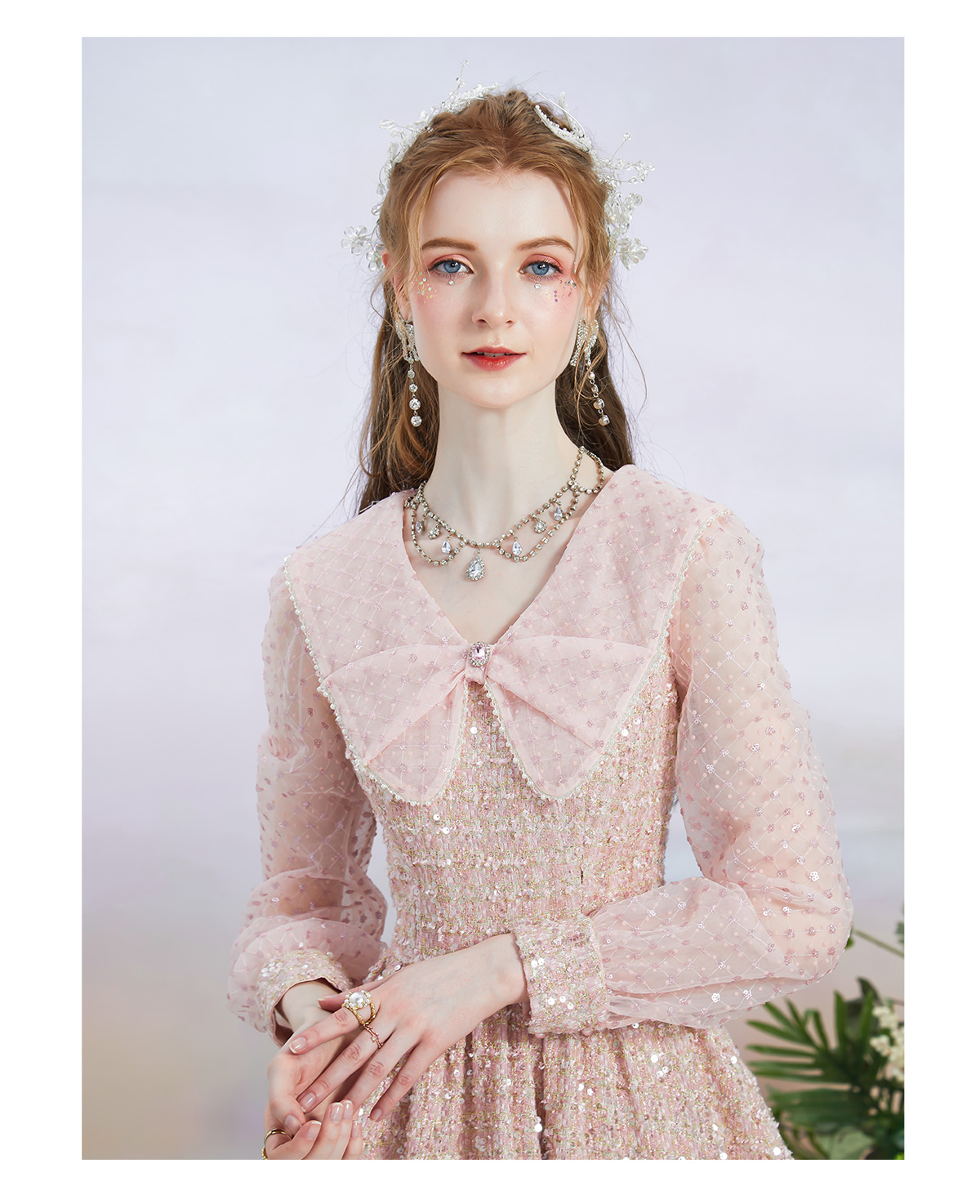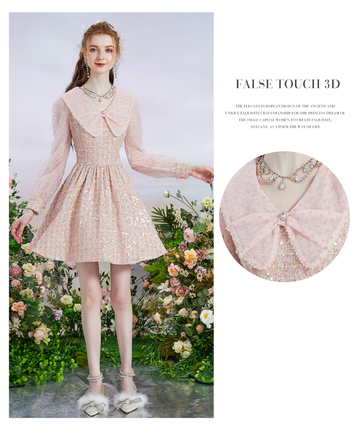 花兒開了2023秋季新款亮片粗花呢拼接網紗連衣裙女氣質短款公主裙