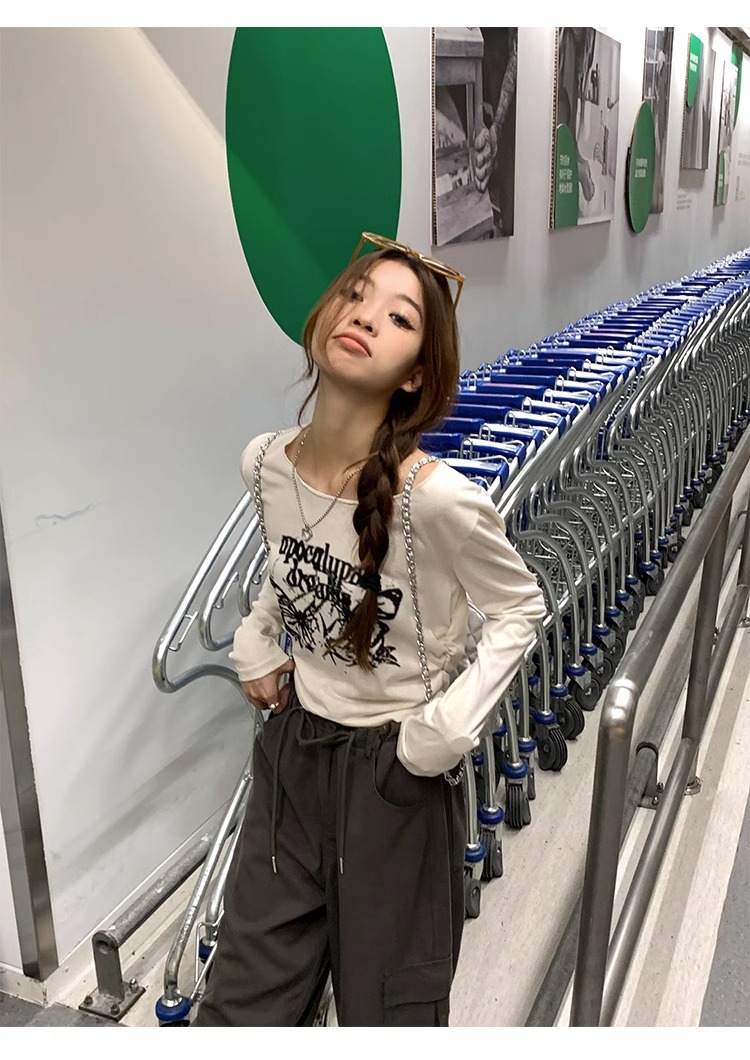 純欲設計感鏤空露肩辣妹上衣女早秋修身顯瘦潮牌印花長袖T恤內搭