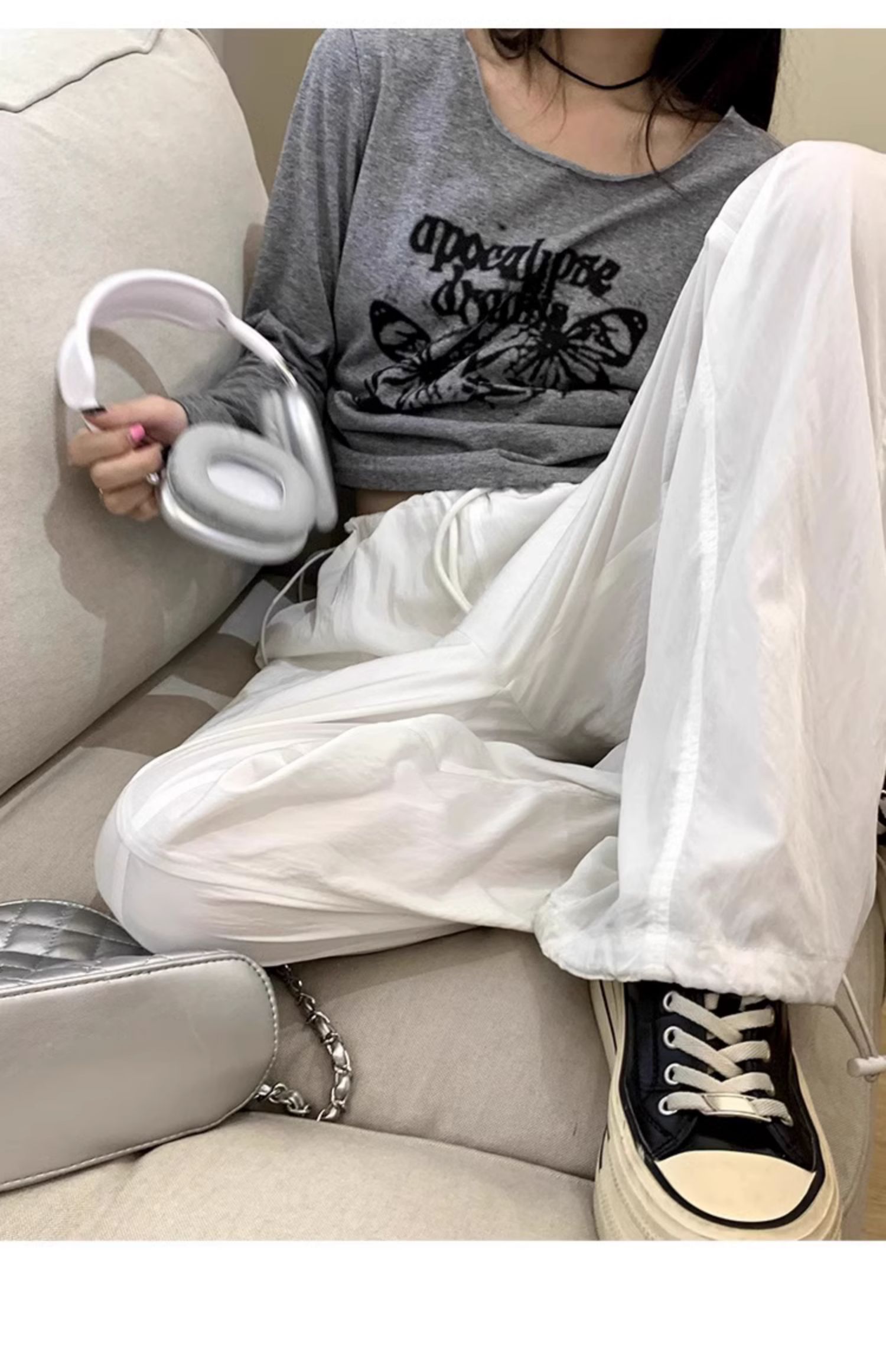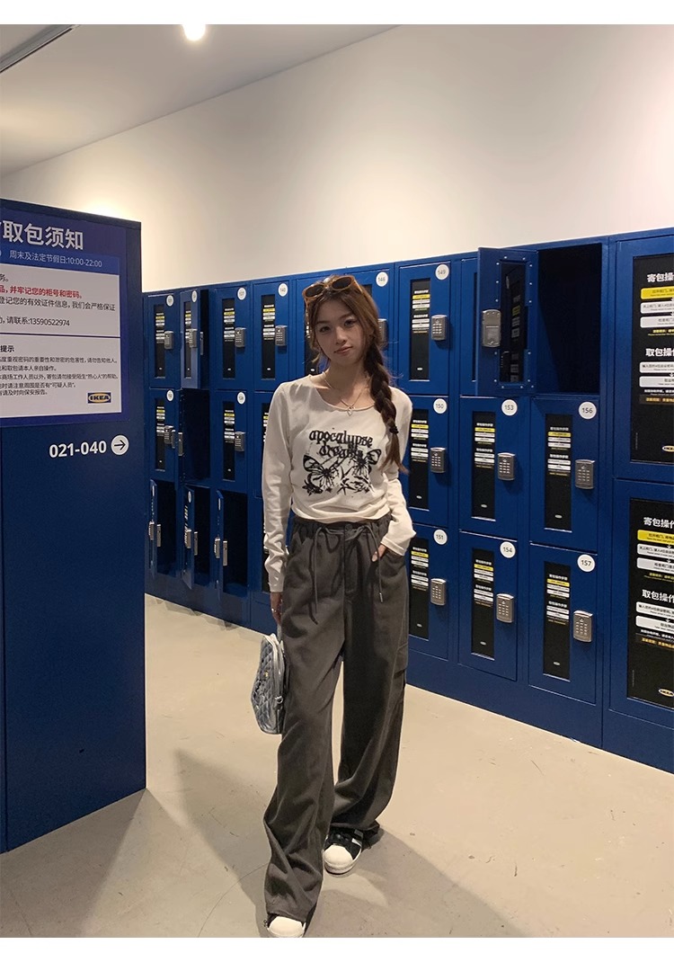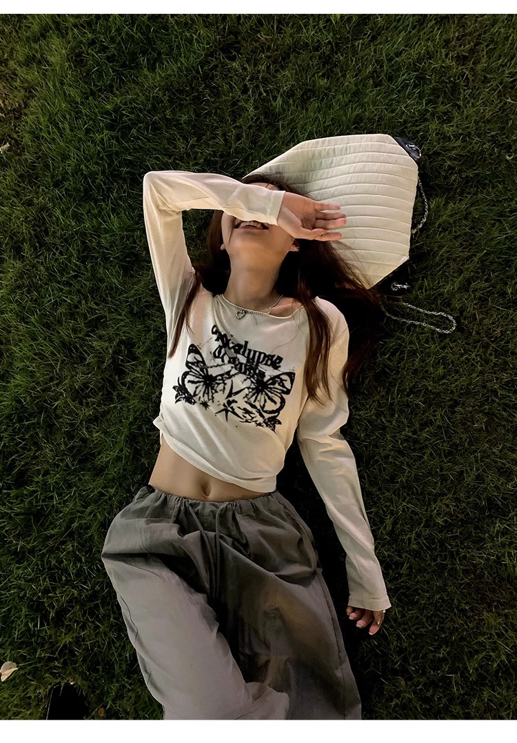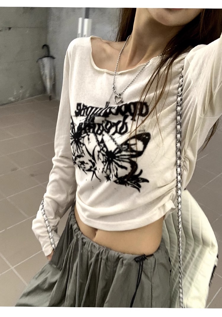 美式復古蝴蝶字母印花長袖T恤女早秋辣妹潮牌設計感做舊短款上衣