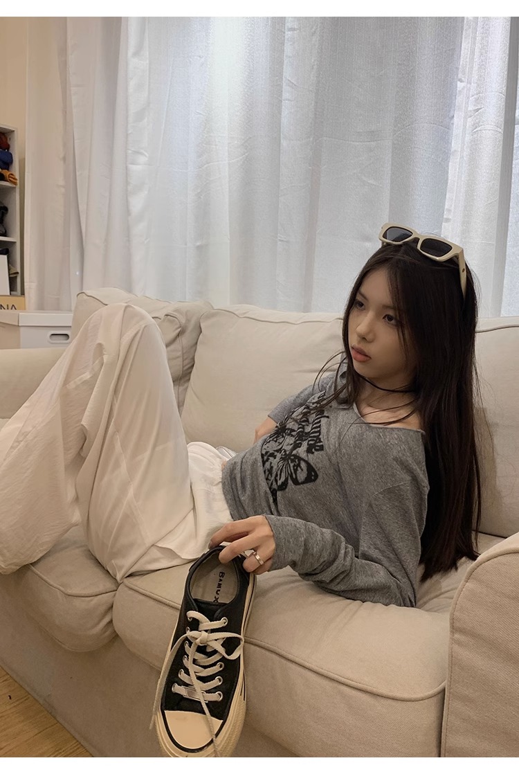 小眾設計感寬松正肩長袖T恤春秋美式復古插肩百搭甜辣上衣女