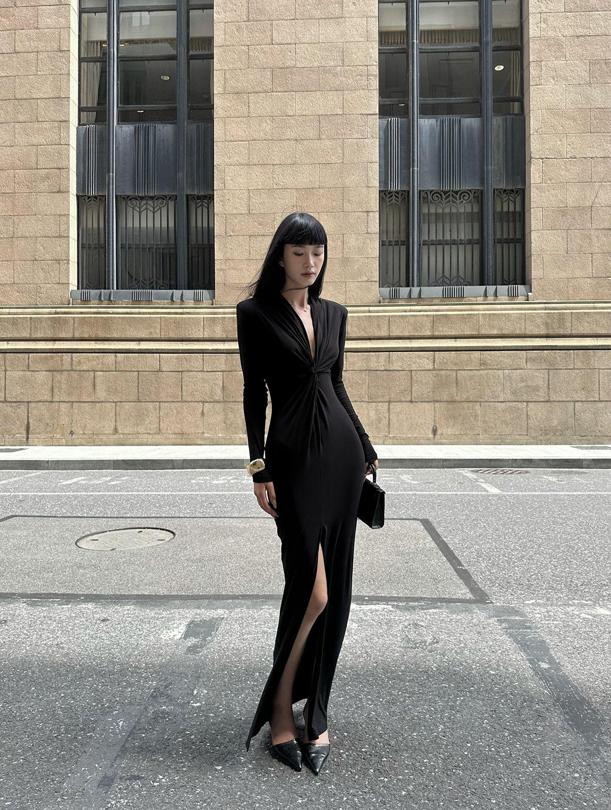 小諾本人v領連衣裙2023韓版小眾溫柔風長裙高級感長袖包臀裙5818