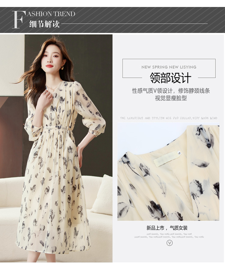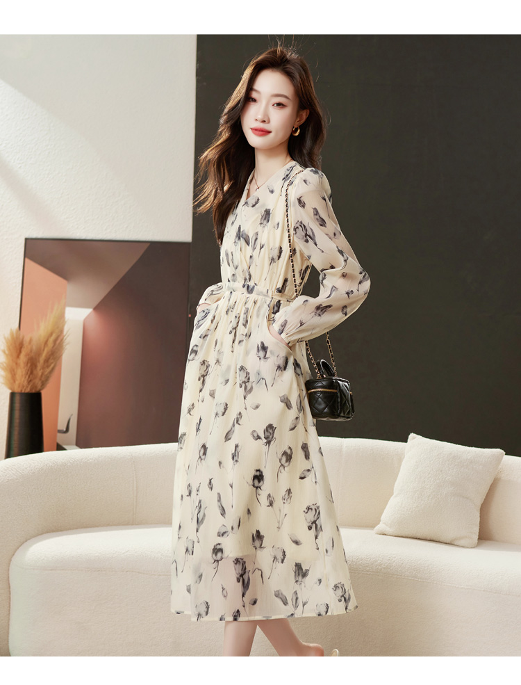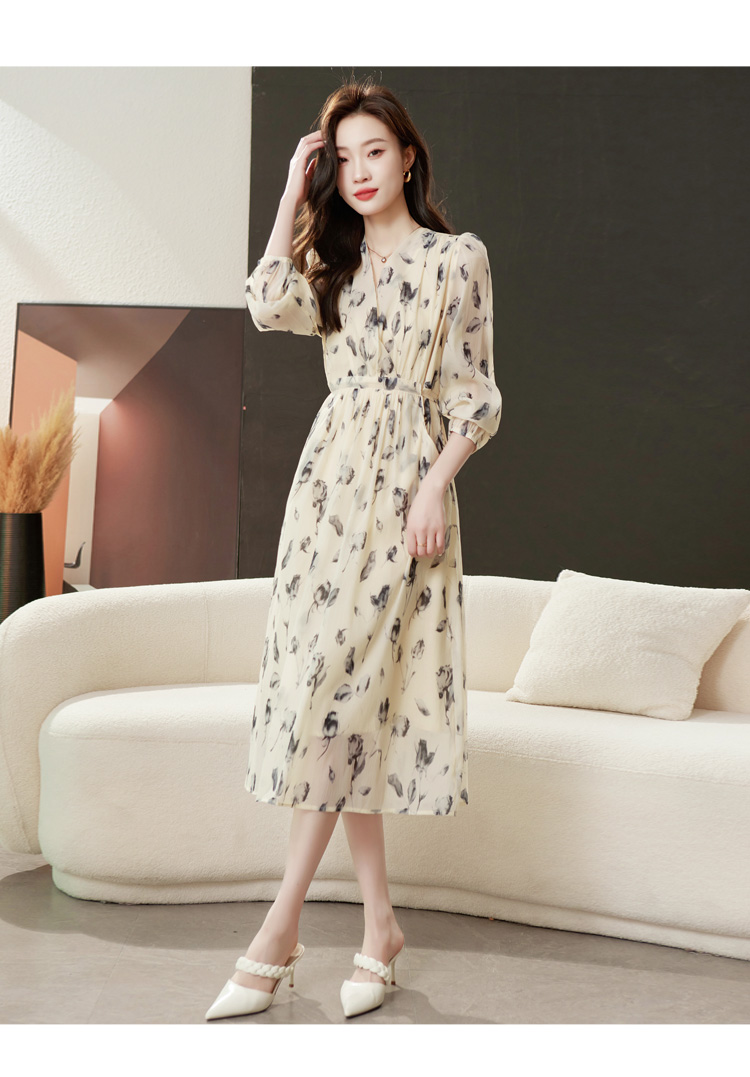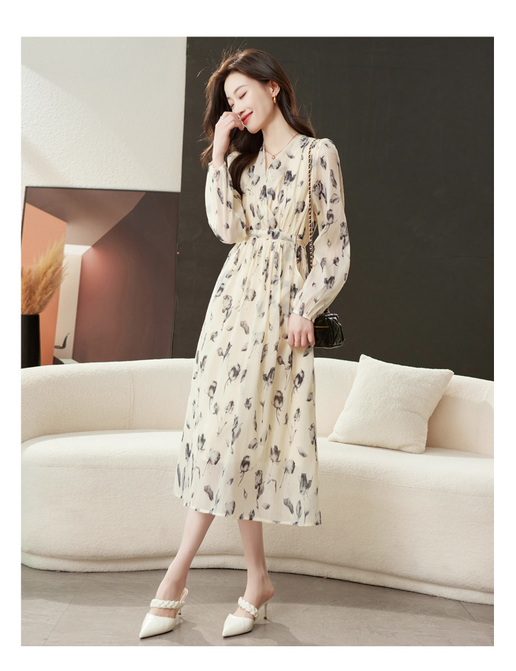 法式長袖雪紡碎花連衣裙秋季2023新款v領修身氣質顯瘦a字裙子女仙