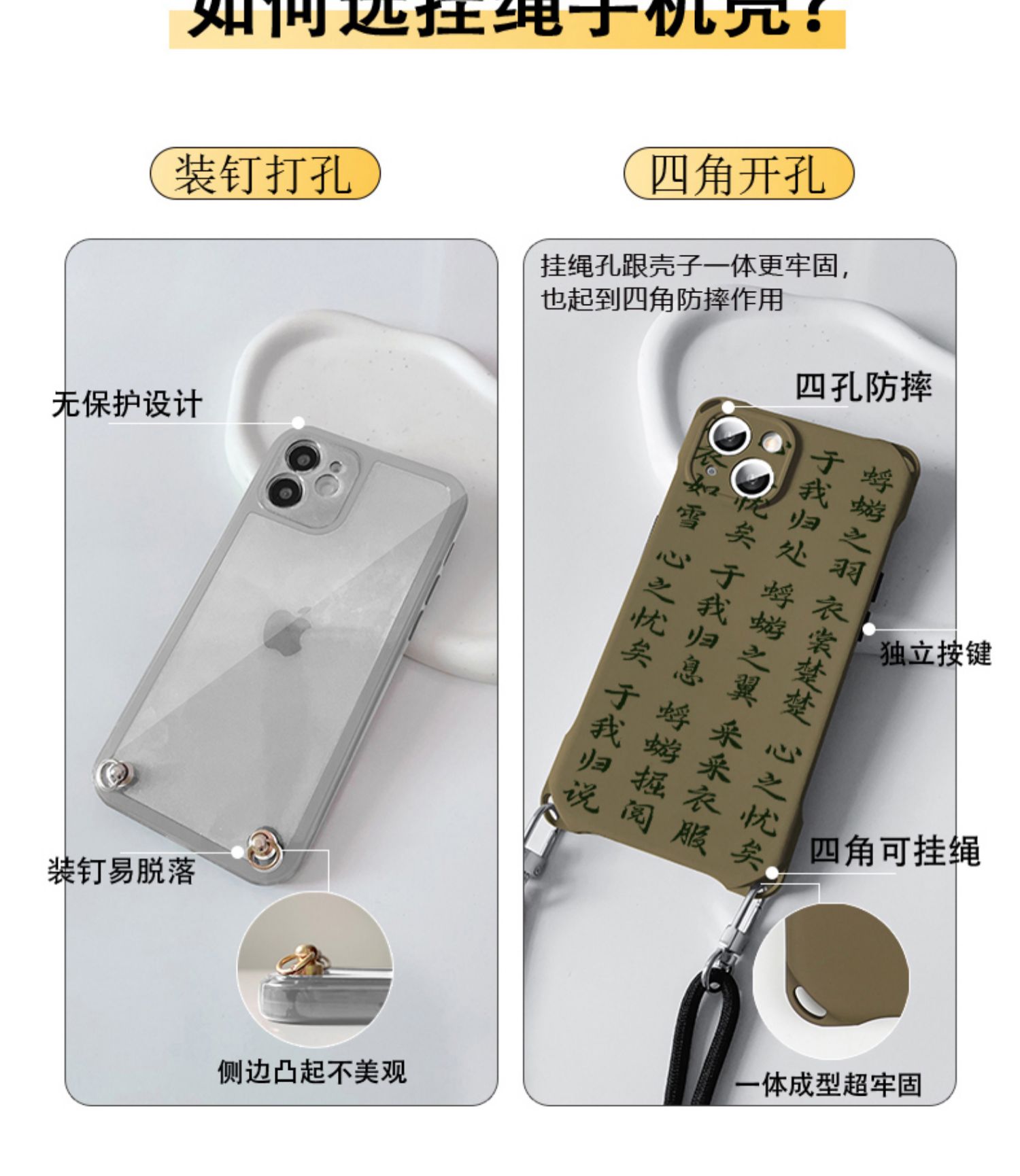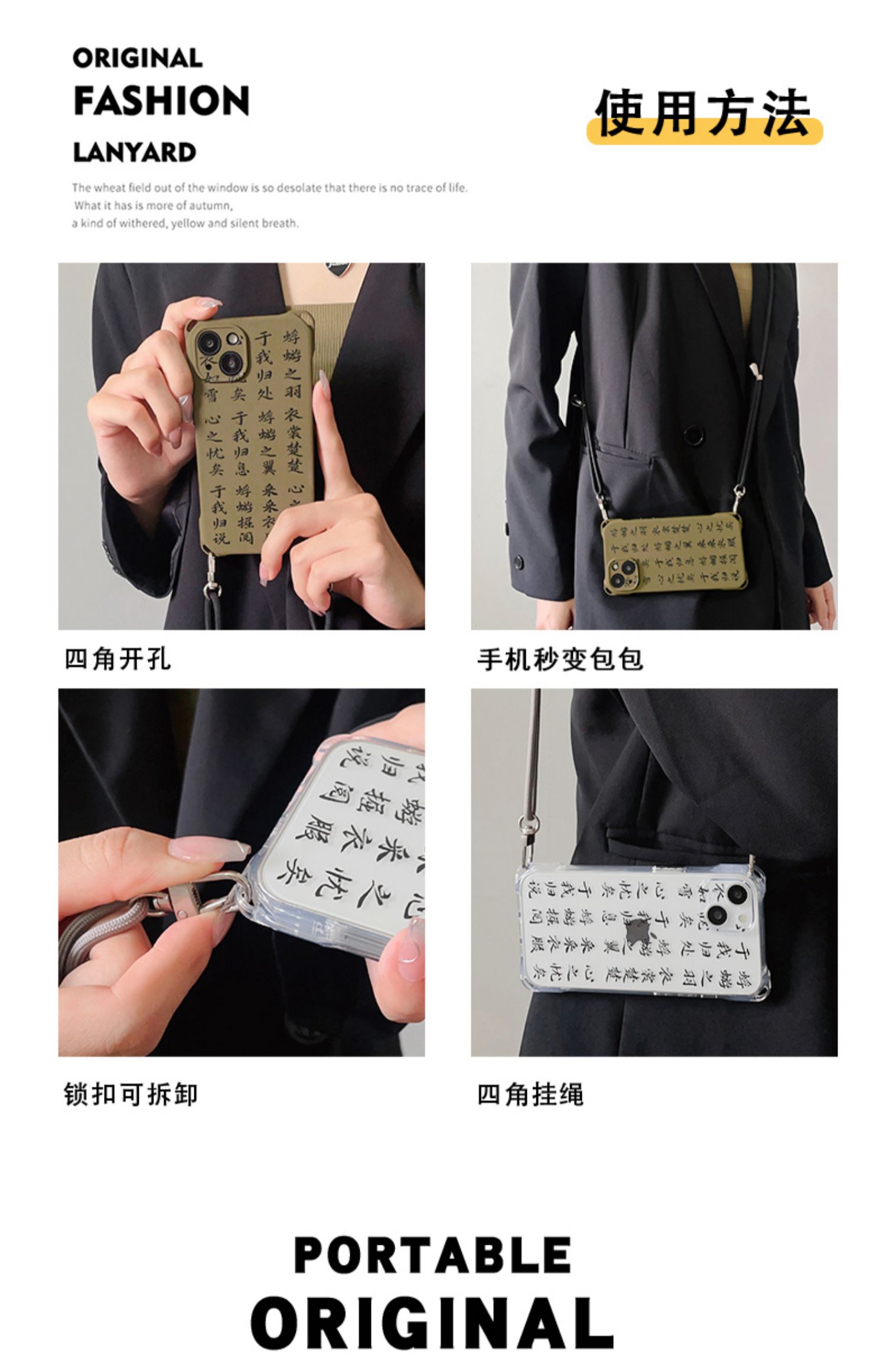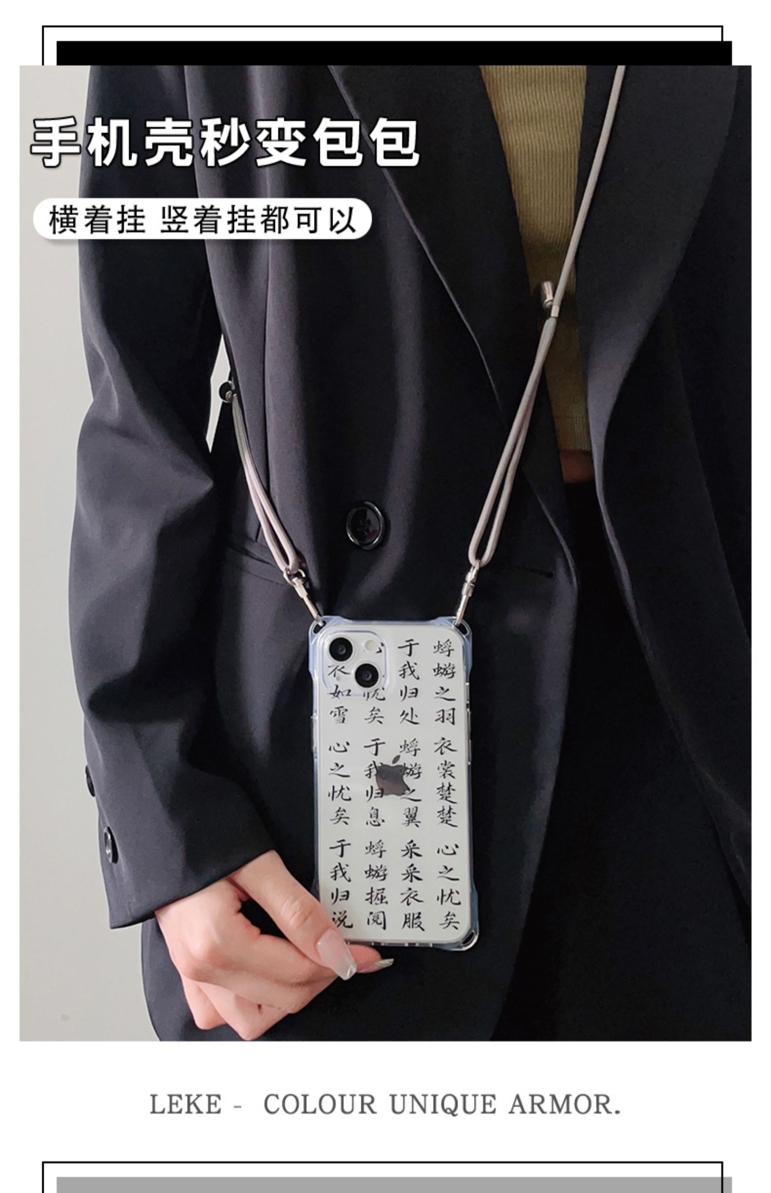 國風蘋果14手機殼掛繩斜挎可背適用iphone14promax四角開孔硅膠13詩詞文字11pro單肩可調節12新中式x樂殼原創