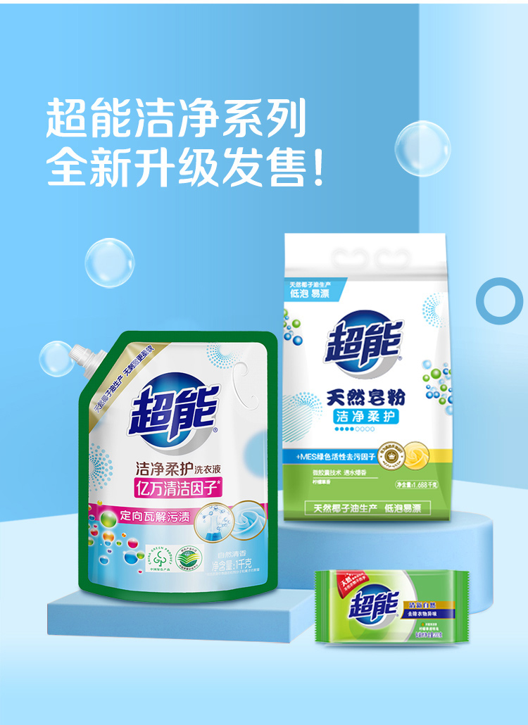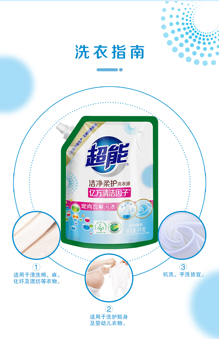 超能潔凈柔護洗衣液1kg+500g袋裝補充裝深層潔凈持久留香洗衣液